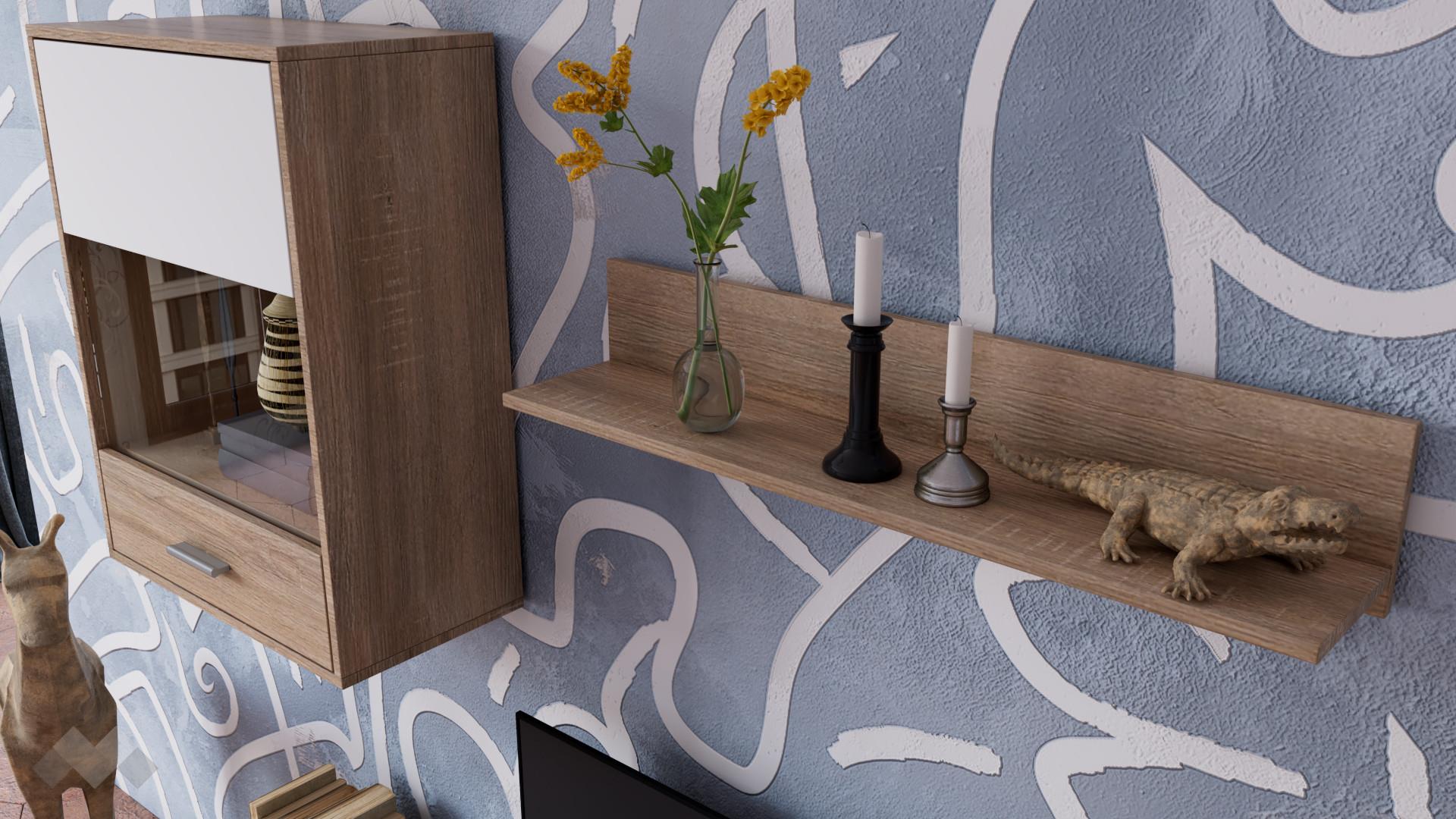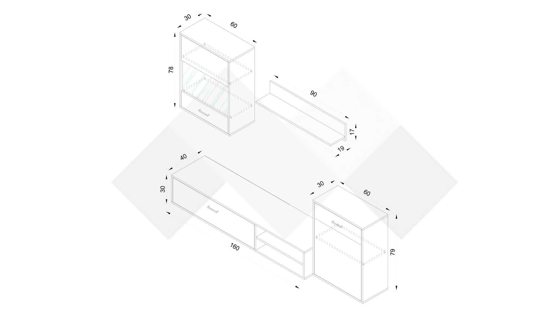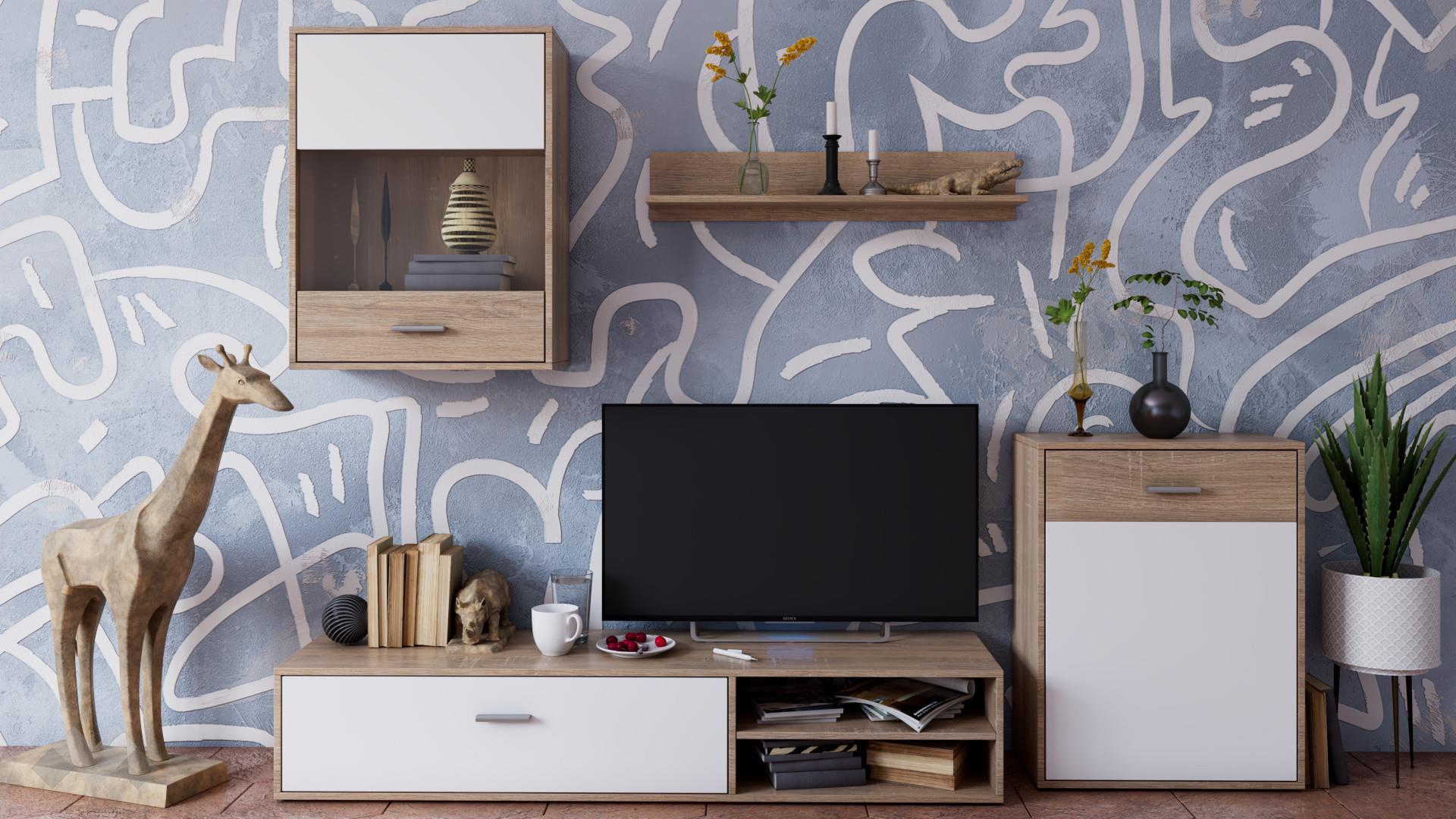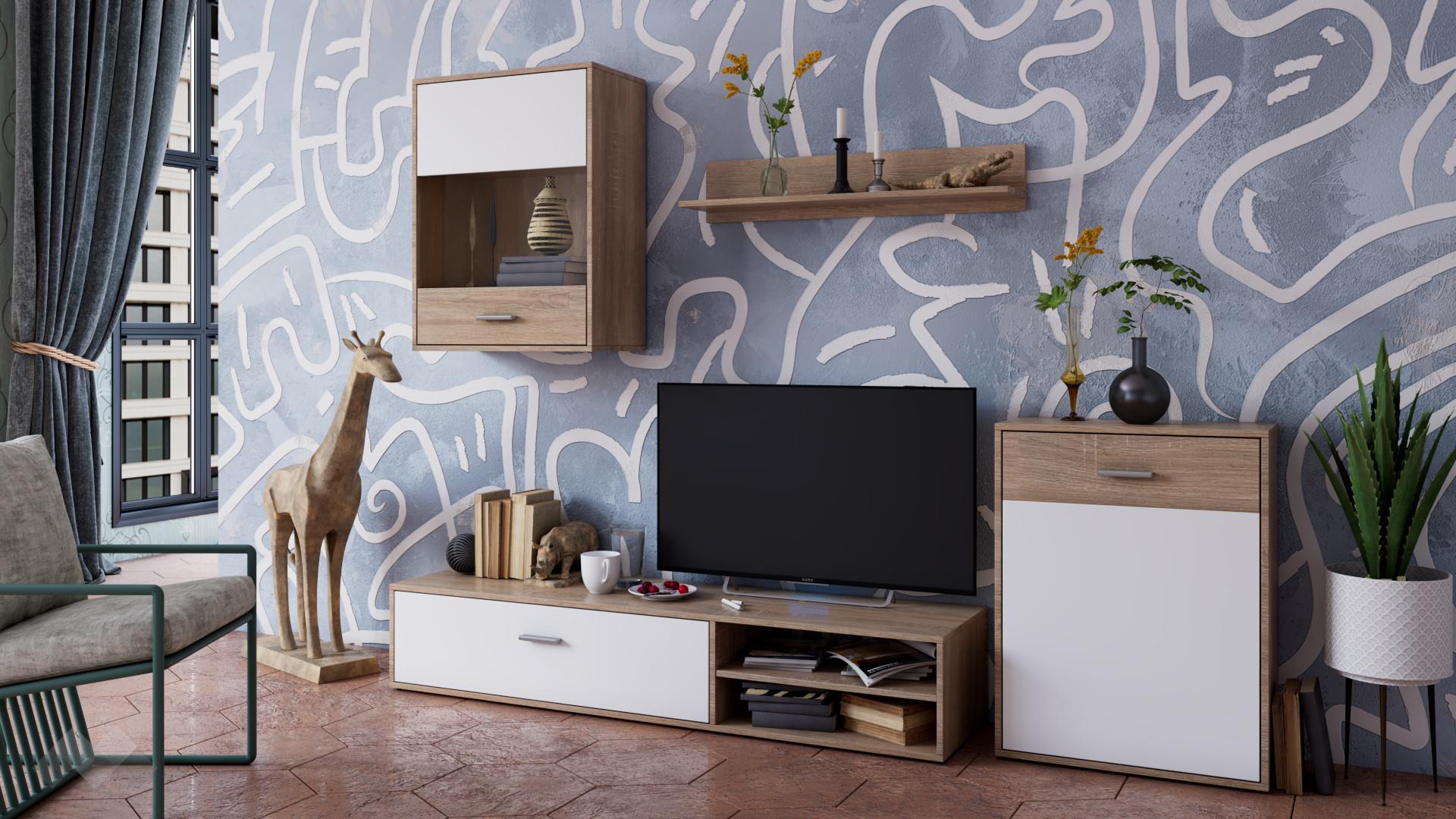 ⭐ Предимства: ✓ модерен дизайн ✓ ТВ шкаф ✓ висок шкаф ✓ окачен шкаф ✓ етажерка ✓ 16 мм ПДЧ
