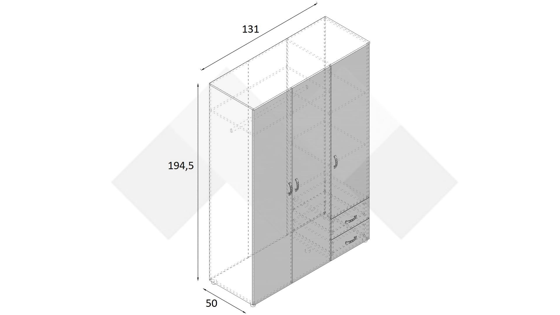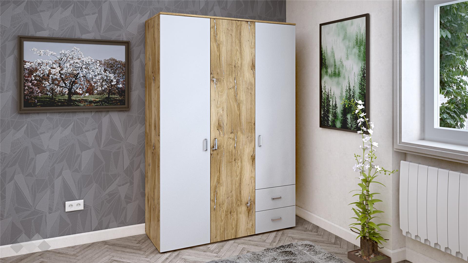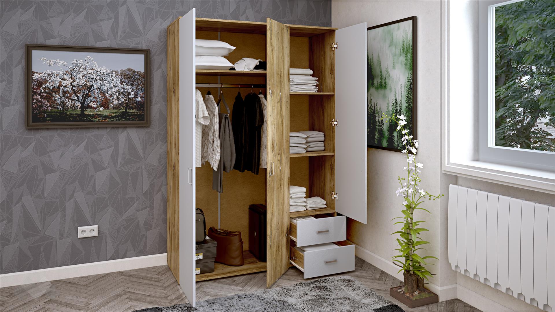 ⭐ Предимства: ✓ 16 мм ПДЧ ✓ трикрилен ✓ 3 рафта ✓ 2 чекмеджета ✓ лост за закачалки ✓модерен дизайн ✓ практично разпределение ✓ качествена изработка