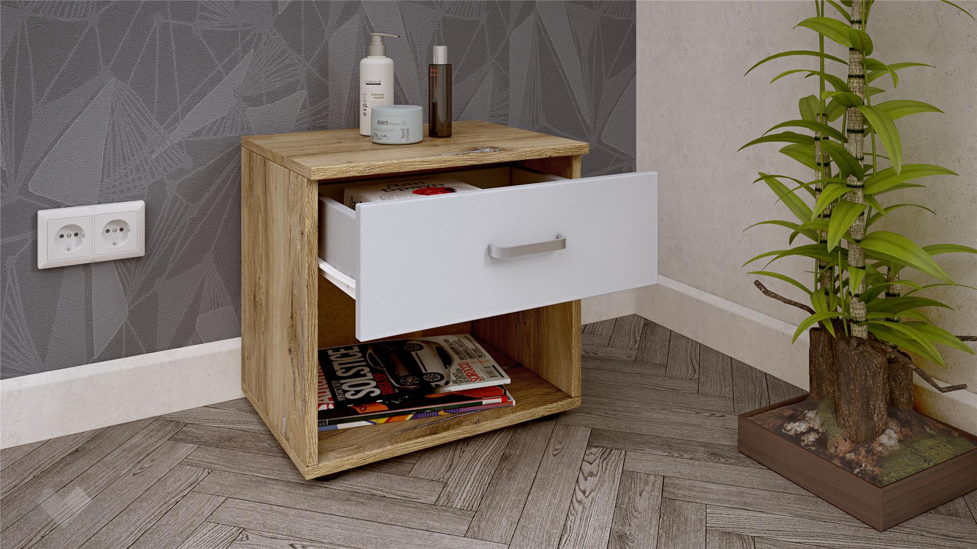 С оптималната си височина, нощният шакф предоставя допълнително удобство към всяко легло - нощна лампа, чаша вода или любима книга преди сън, са на една ръка разстояние от теб. Чекмеджето и отворения рафт ти дават още място за вещи, необходими за спокойния ти сън.