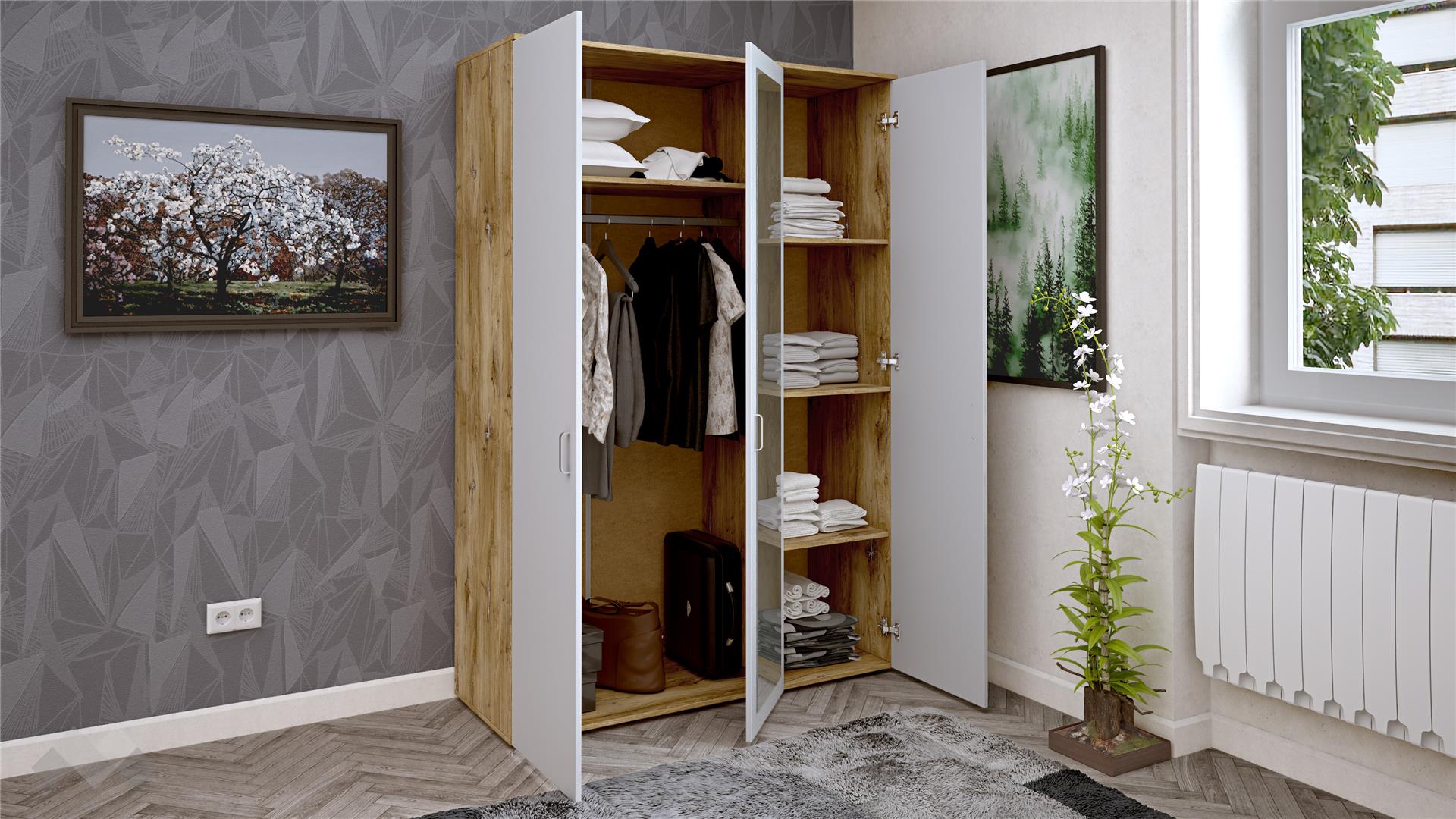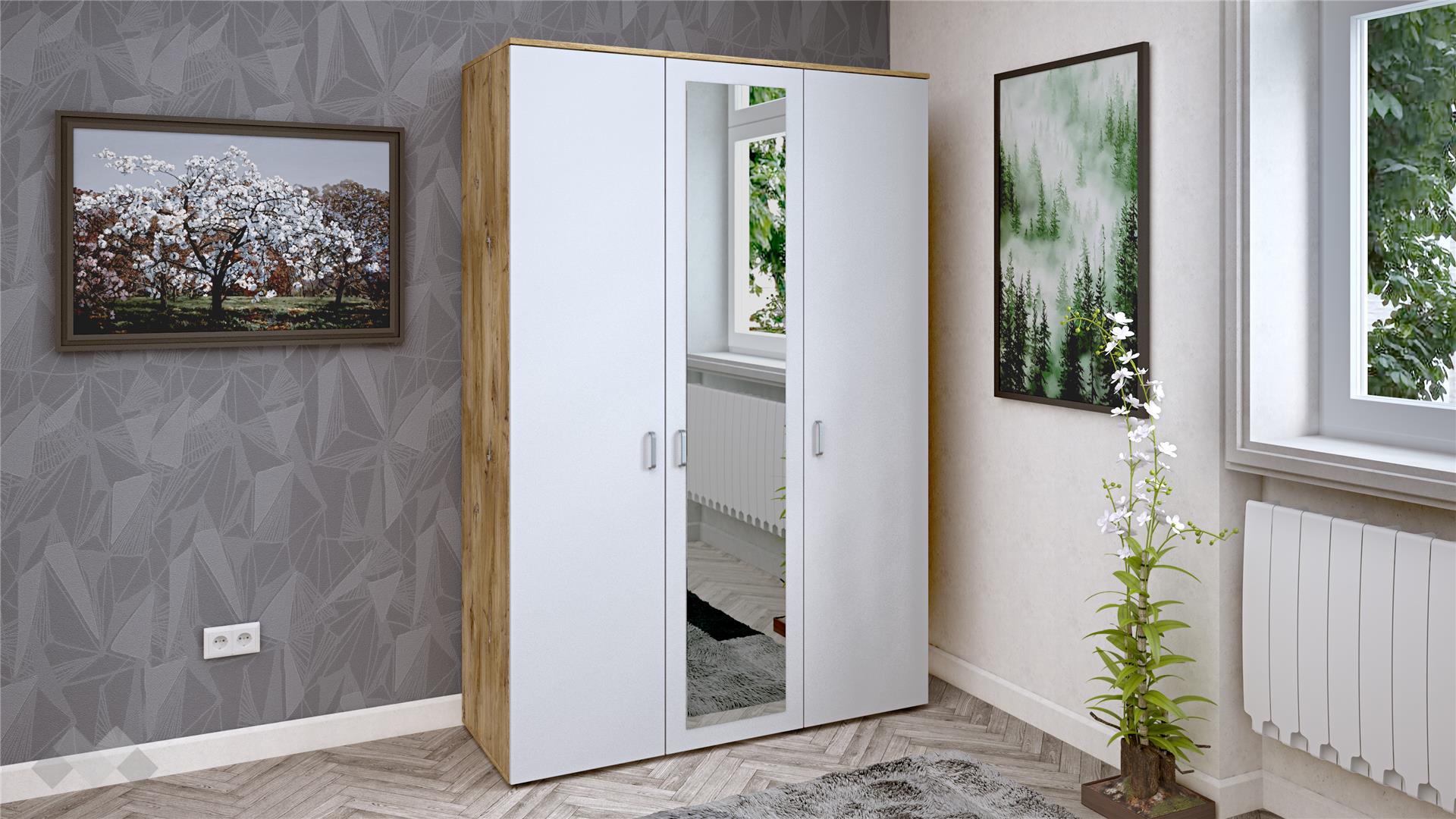 Трикрилен гардероб с огледало Селтик е изработен от 16 мм ПДЧ, гарантиращо здравина и устойчивост.