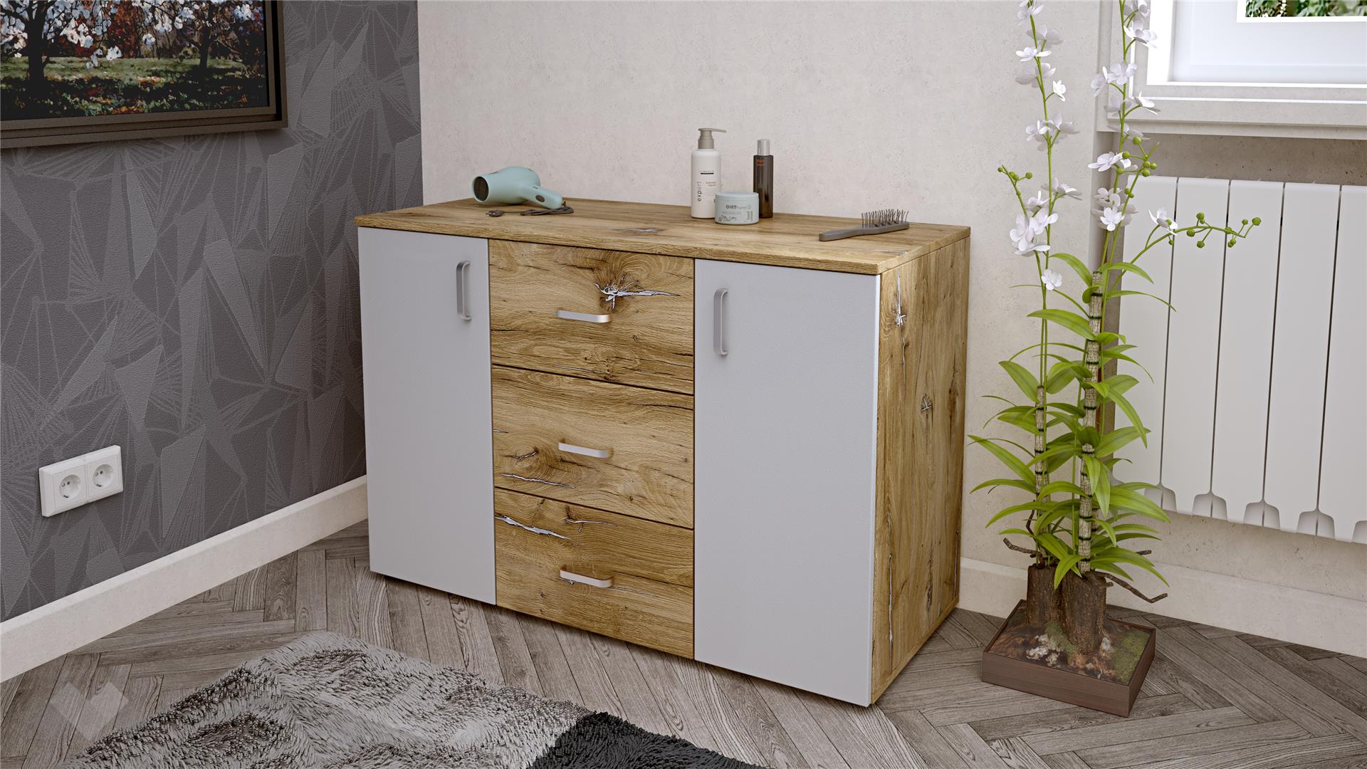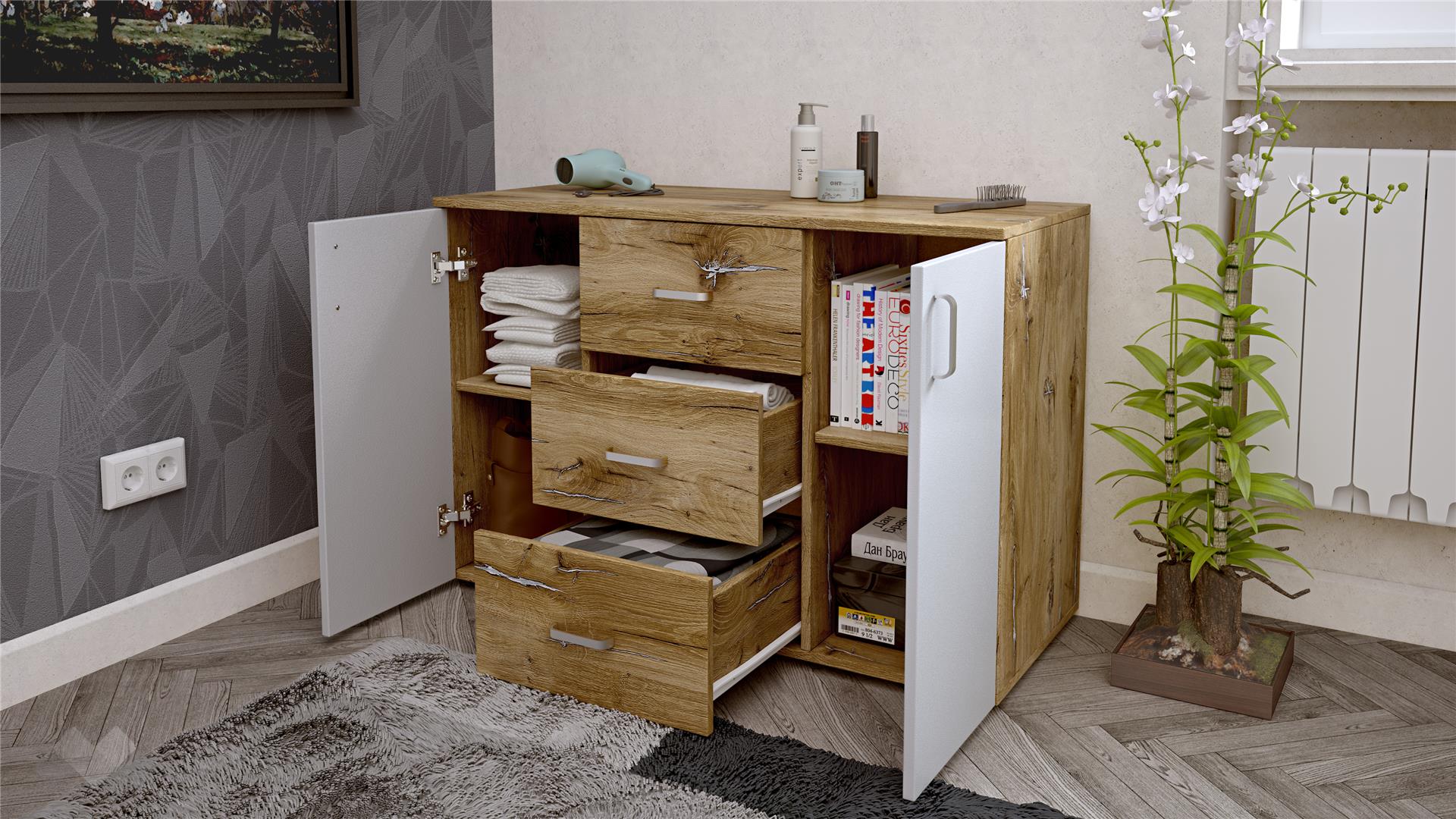 Трите чекмеджета и двта рафта зад вратите са удобни за подреждане на сгънати дрехи, обувки и кутии за съхранение. Просторния плот ти предоставя място за вещи, които да са ти винаги под ръка.