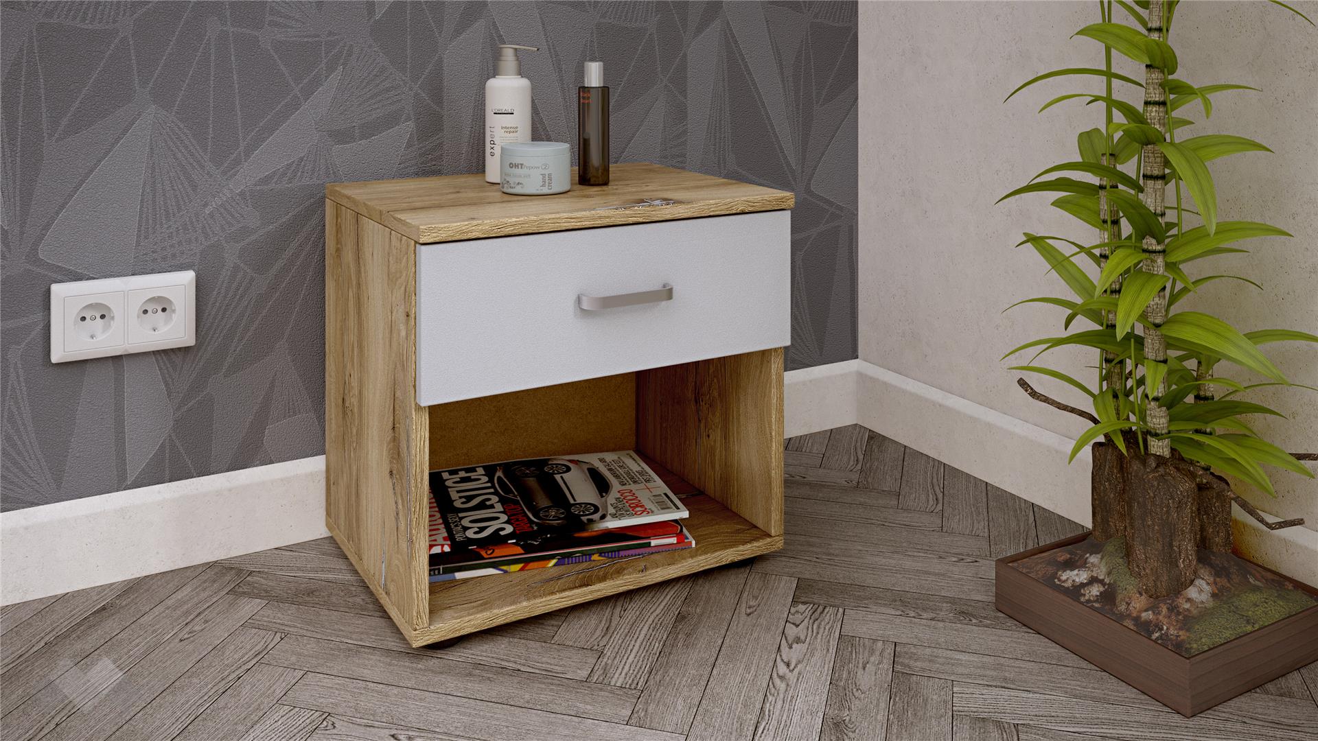 С оптималната си височина, нощният шкаф предоставя допълнително удобство към всяко легло - нощна лампа, чаша вода или любима книга преди сън, са на една ръка разстояние от теб. Чекмеджето и отворения рафт ти дават още място за вещи, необходими за спокойния ти сън.