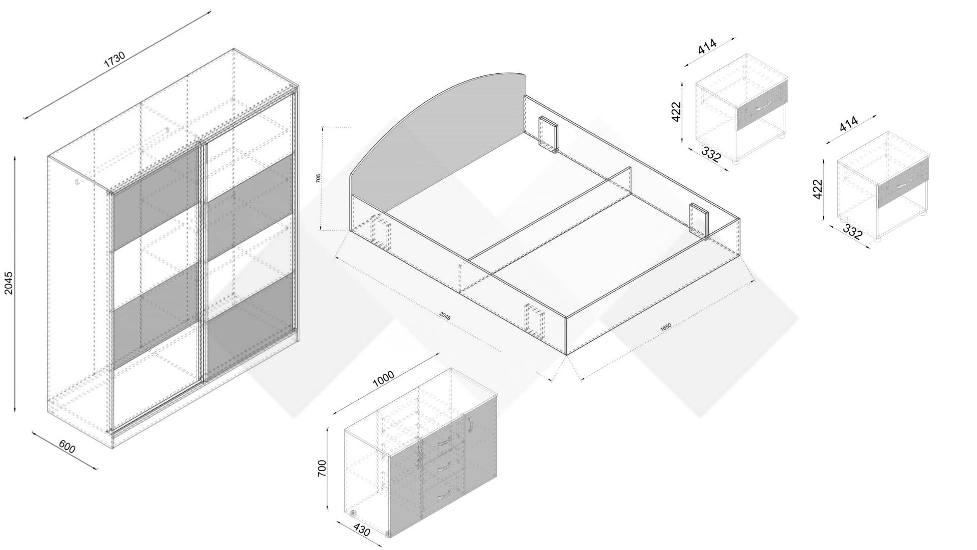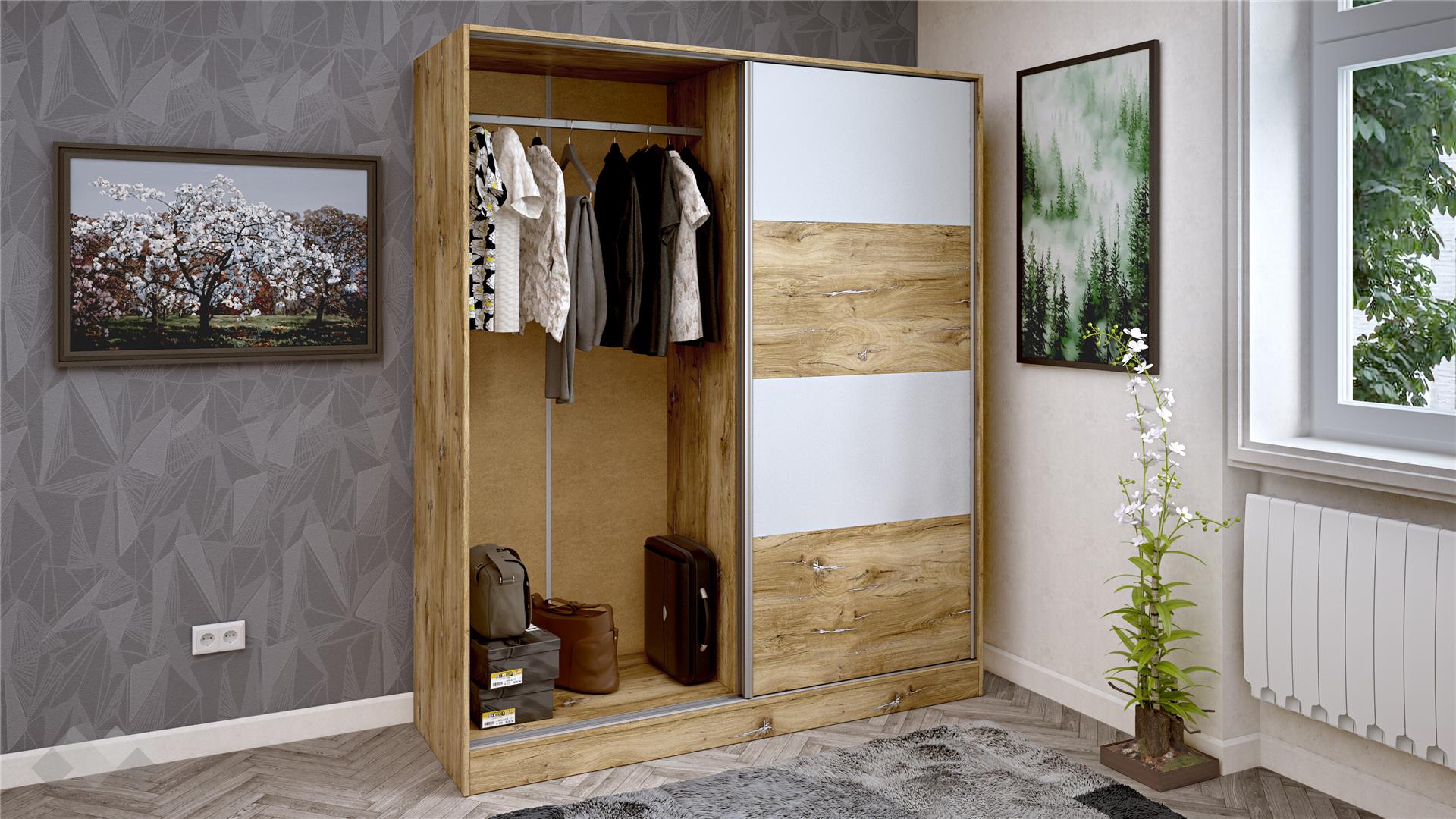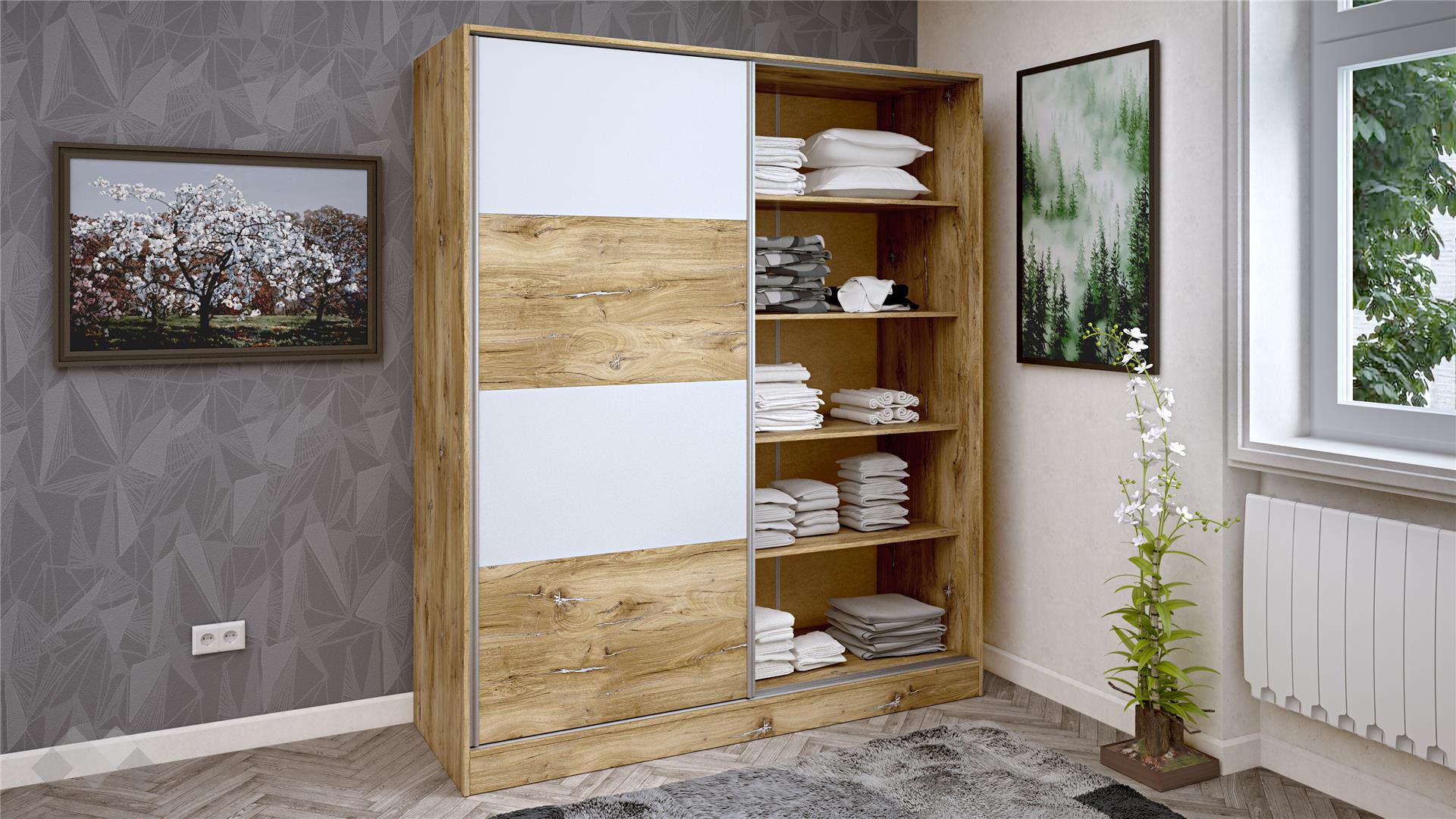 ⭐ Предимства: ✓ 16 мм ПДЧ ✓ спалня за матрак 160/200 ✓ гардероб с плъзгащи врати ✓ лост за закачалки ✓ 4 рафта ✓ нощен шкаф ✓ 1 чекмедже ✓ отворен рафт ✓ скрин ✓ 3 чекмеджета ✓ 2 врати ✓ модерен дизайн ✓ качествена изработка