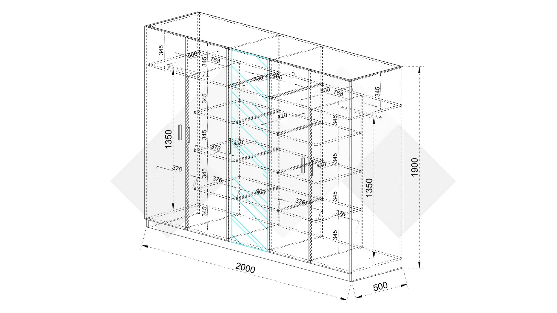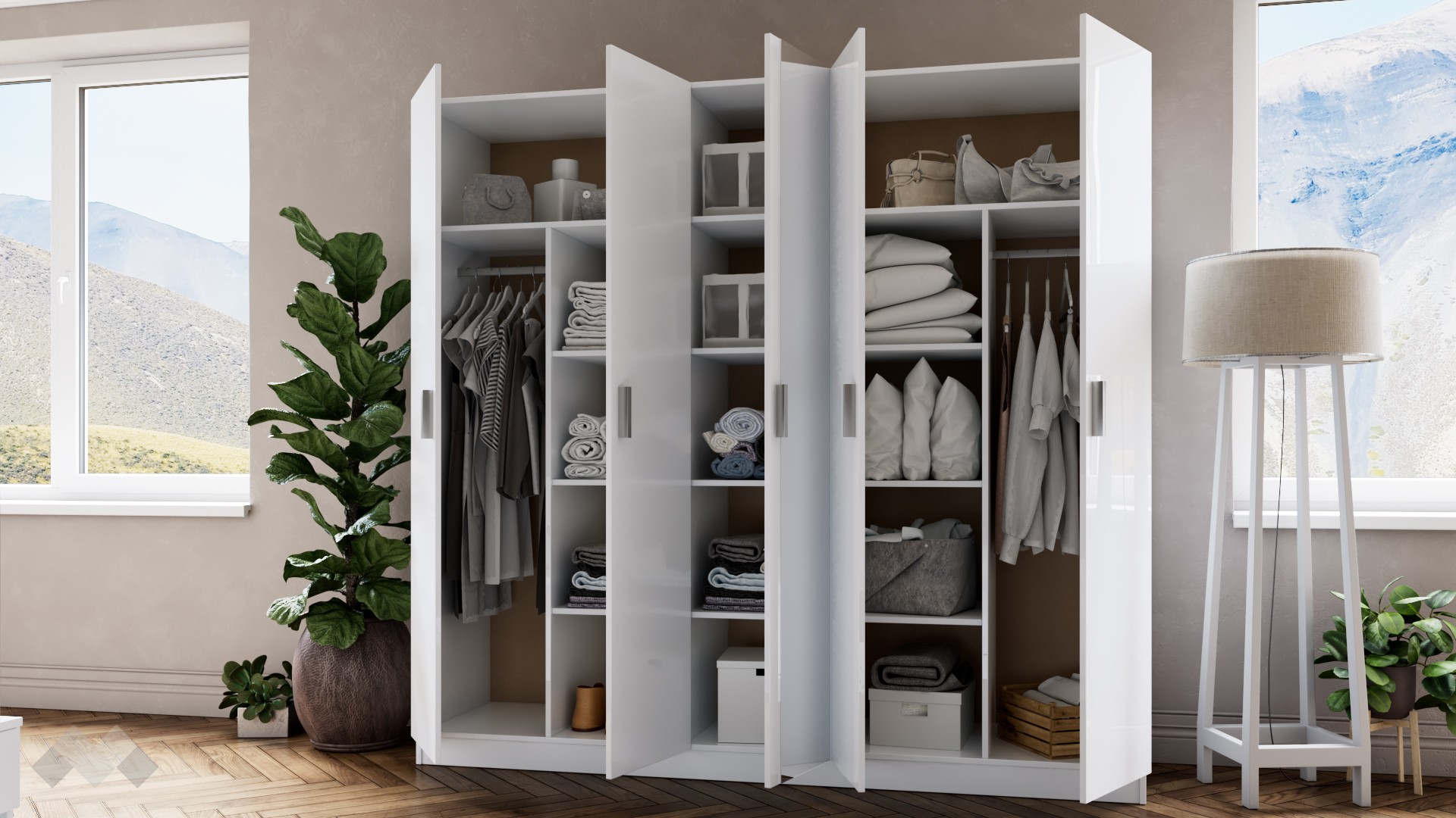 Гардеробът е петкрилен, с практично разпределение, което ти позволява да подредиш добре всички вещи. На твое разположение са общо 12 рафта и 2 лоста за закачалки. Можеш да използваш рафтовете за организиране на завивки, сгънати дрехи, бельо, аксесоари, кутии за съхранение или други необходими за теб неща. Лостовете за закачалки са подходящи за елегантното облекло, което се мачка лесно. Ще ти допадне и огледалото, разположено на една от вратите – то превръща гардероба в незаменим помощник при избора на тоалет.