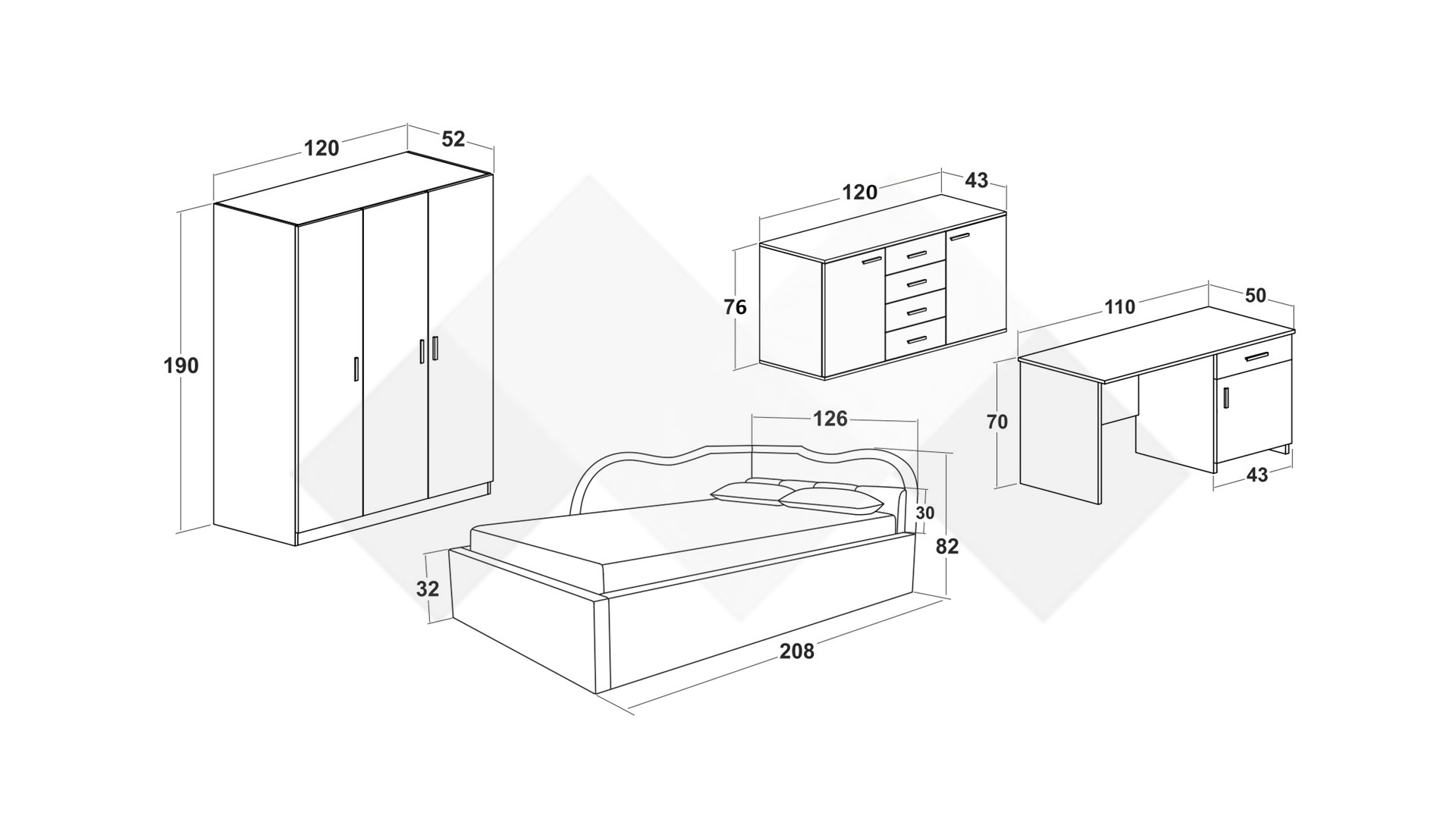 ⭐ Предимства: ✓ легло с тапицирана табла и основа ✓ трикрилен гардероб ✓ лост за закачалки  ✓ скрин с 4 чекмеджета и 2 шкафа ✓ бюро ✓ модерен дизайн ✓ елегантна визия ✓ повдигащ механизъм ✓ качествена изработка