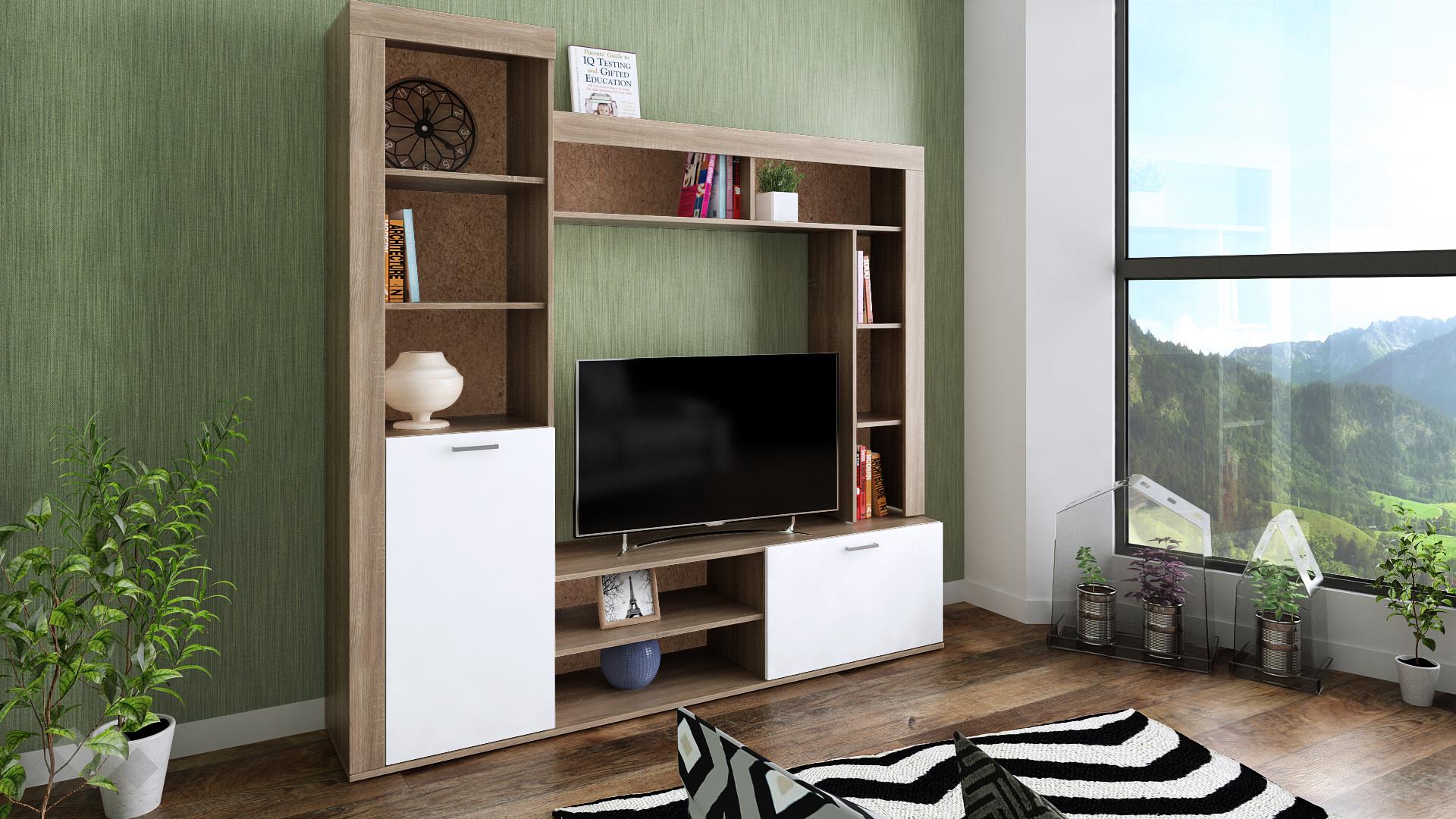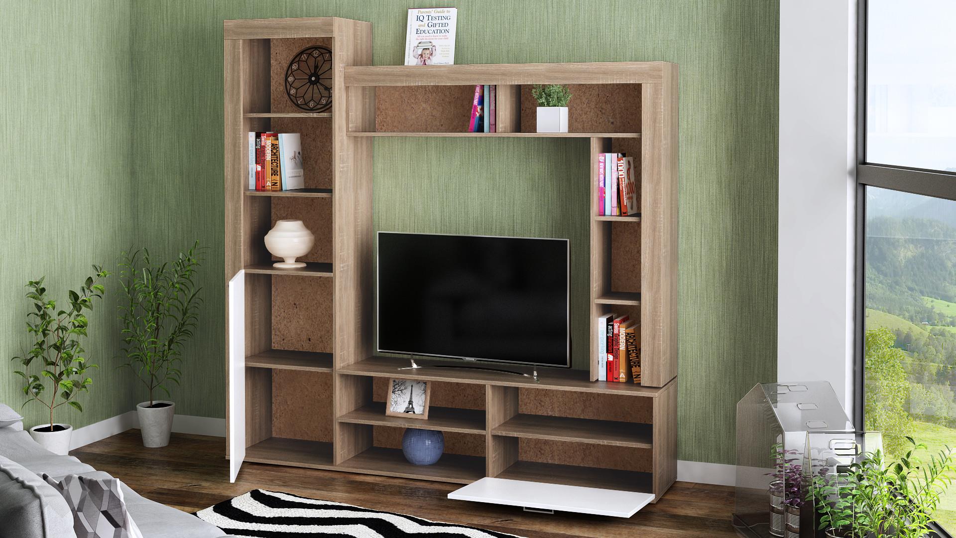 ⭐ Предимства: ✓ модерен дизайн ✓ ТВ шкаф ✓ висок шкаф ✓ етажерка ✓ отворени рафтове ✓ качествена изработка ✓ 16 мм ПДЧ