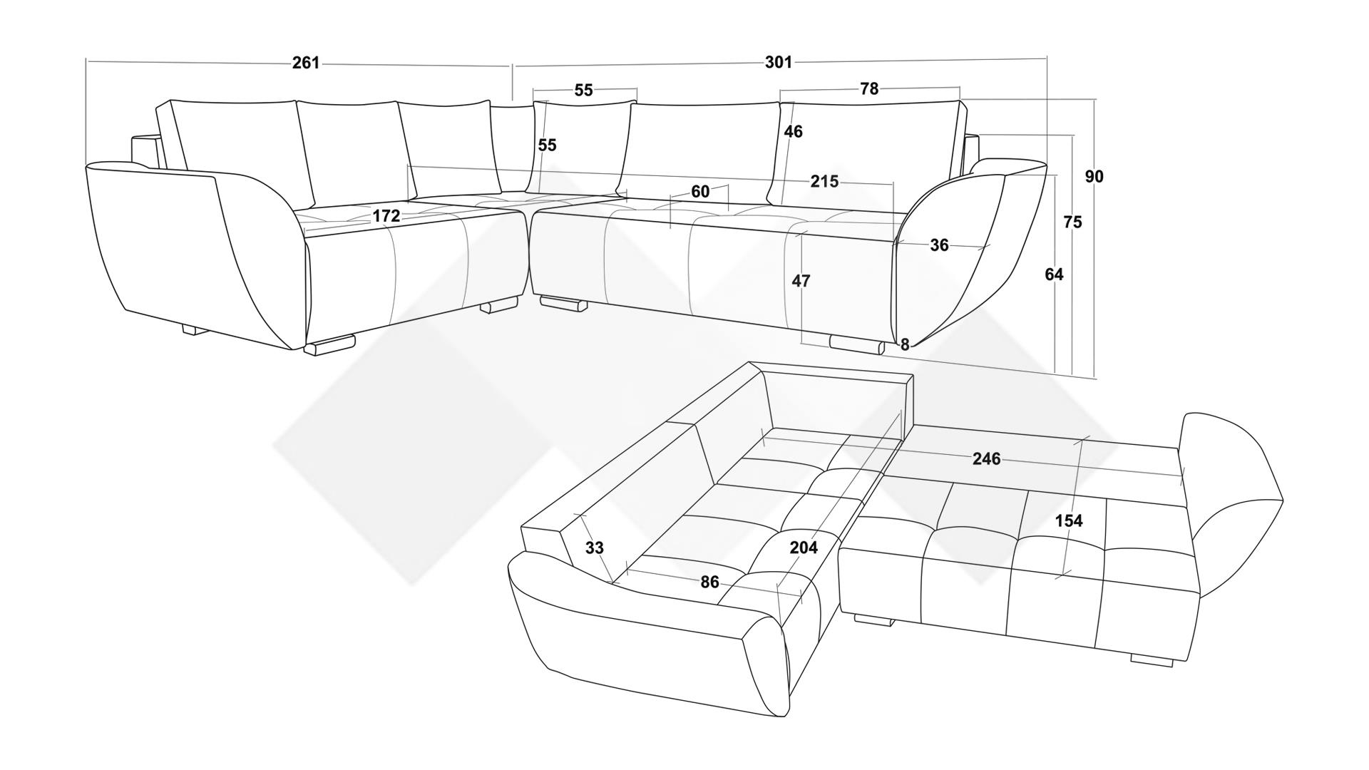 Д: 301 см Ш: 261 см В: 90 см