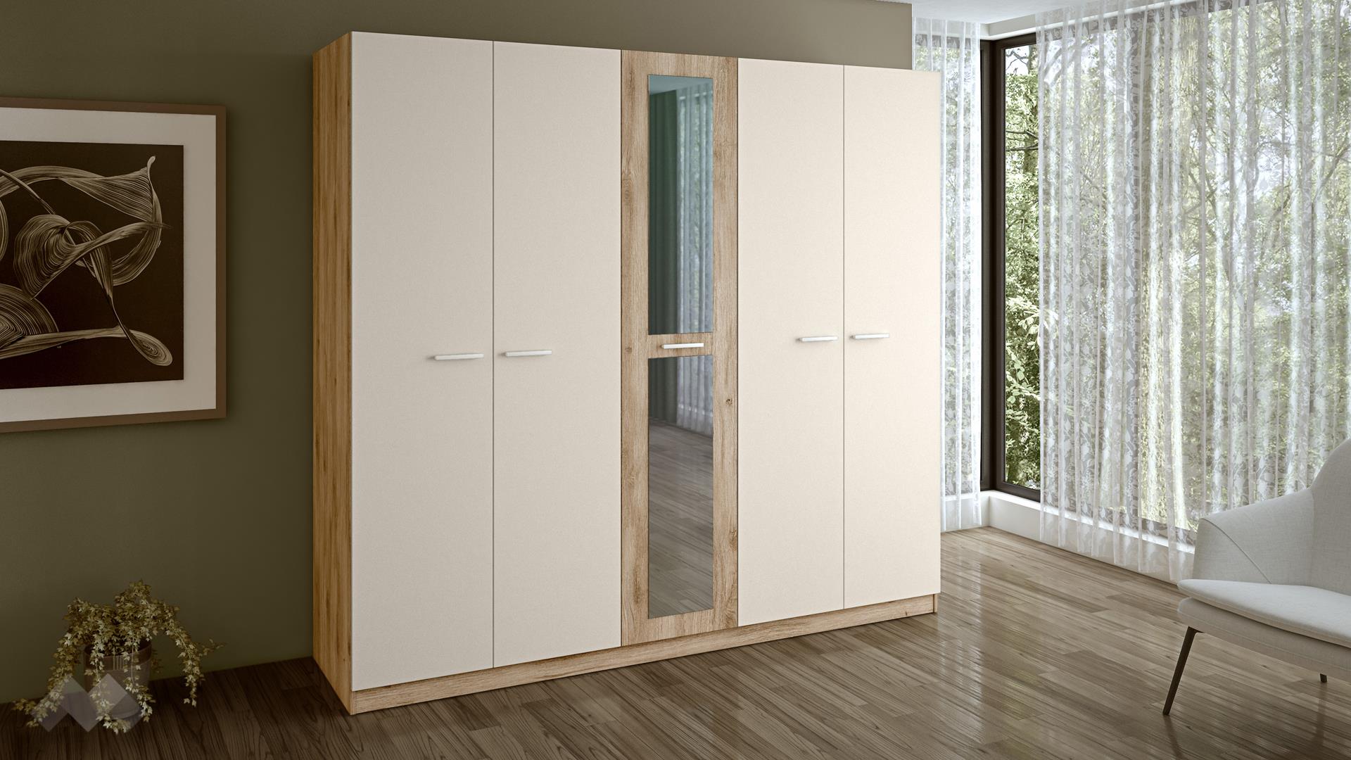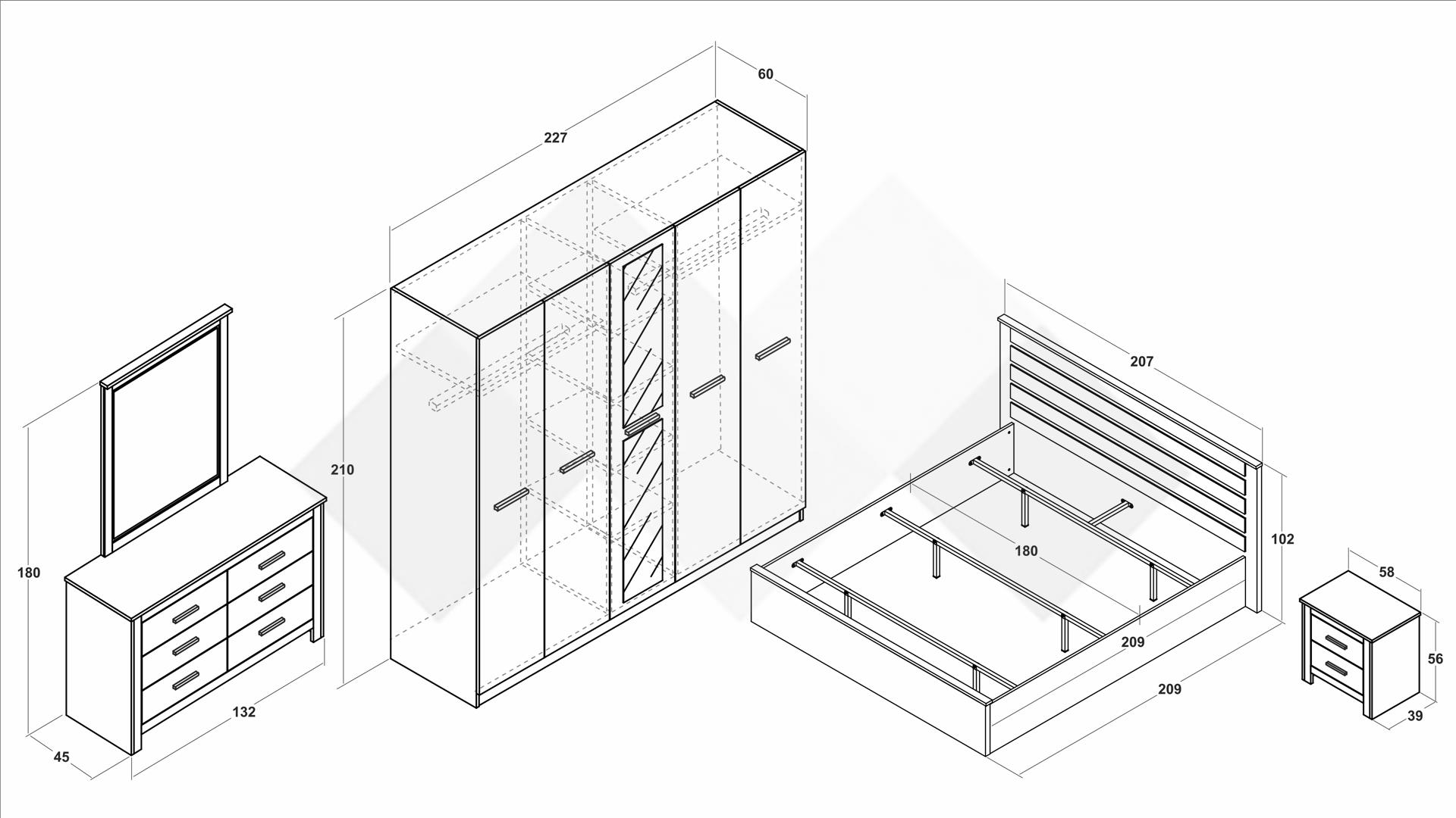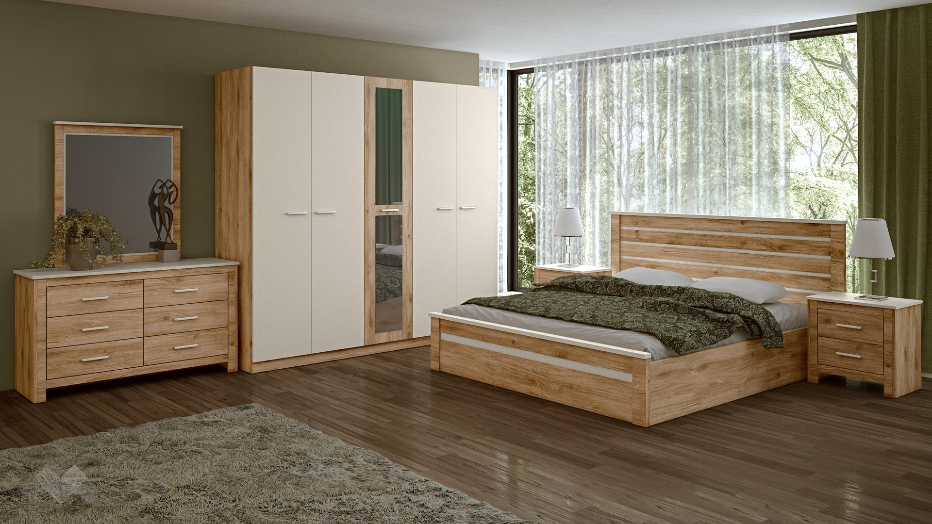 ⭐ Предимства: ✓ 18 мм ПДЧ ✓ спалня за матрак 180/200 ✓ висока табла ✓ 2 нощни шкафчета ✓ петкрилен гардероб с огледала ✓ 4 рафта ✓ 2 лоста за закачалки ✓ скрин с огледало ✓ модерен дизайн ✓ качествена изработка