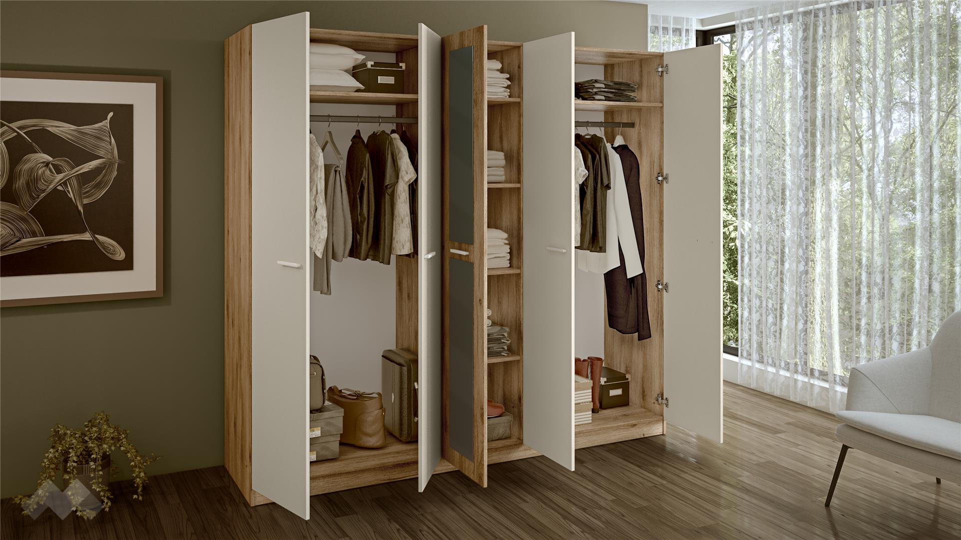 Този впечатляващ гардероб е кулминацията на комплекта, предлагайки максимален капацитет за съхранение. Огледалата не само са функционални, но и придават модерно излъчване и визуално увеличават обема на стаята. Средното крило е оборудвано с две огледала, което не само е изключително практично за обличане, но и оптически разширява пространството в стаята, придавайки усещане за светлина и простор.Всяко крило е с дискретни и елегантни хоризонтални дръжки, които допълват минималистичния дизайн и осигуряват лесно отваряне.