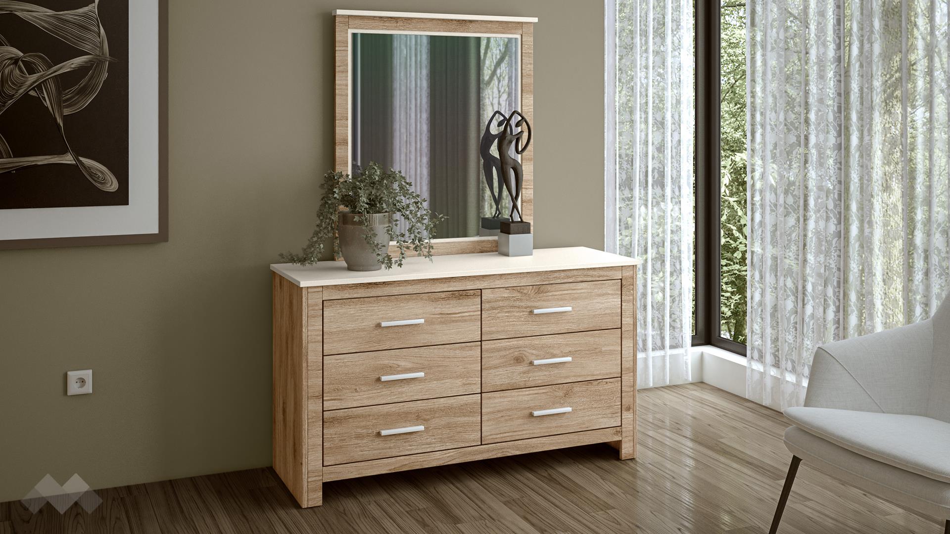 Комплектът включва просторен скрин, който предлага обилно място за съхранение. Разполага с шест чекмеджета, идеални за подреждане на дрехи и други предмети. На скрина е поставено голямо огледало с дървена рамка, което не само е практично, но и визуално разширява пространството и добавя светлина в стаята.