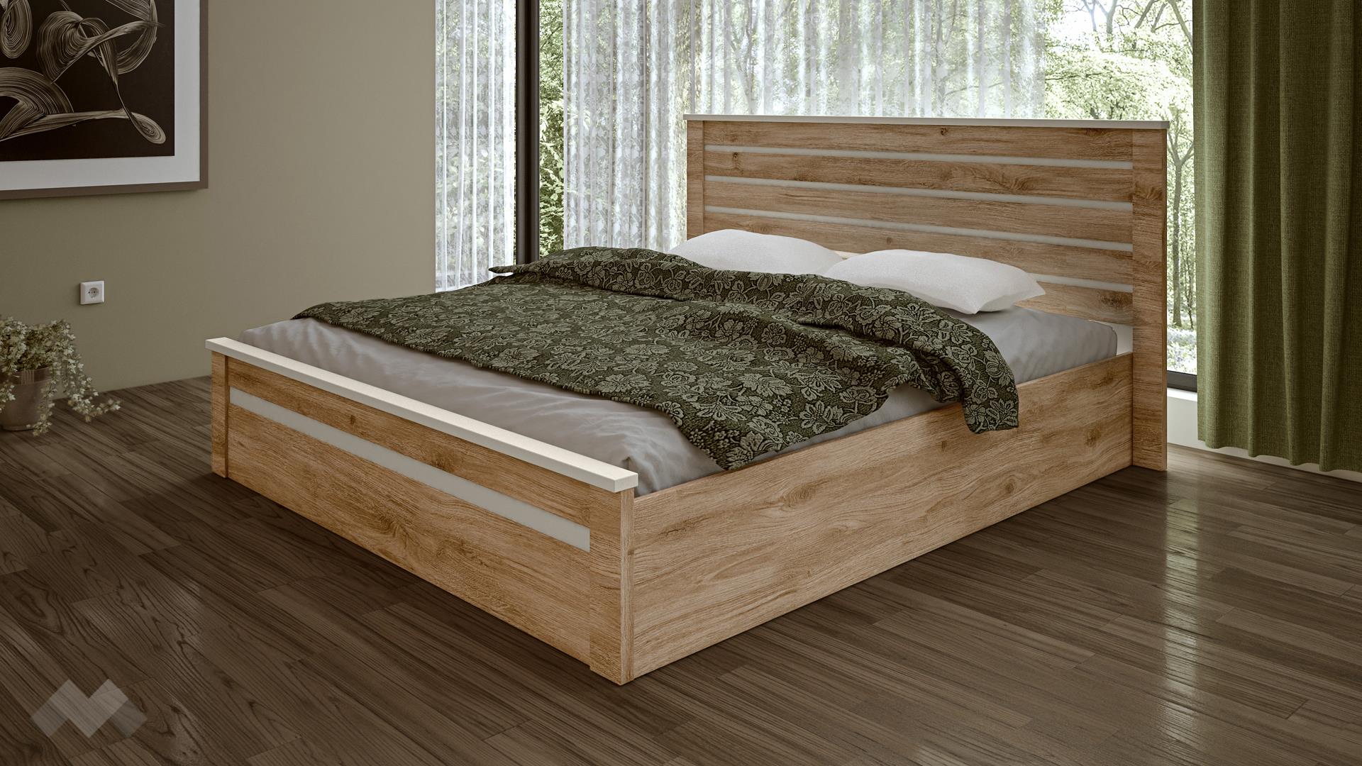 Високата и внушителна табла на леглото е с хоризонтални декоративни елементи в бяло гладко, които прекъсват дървесната текстура и добавят модерен, изчистен акцент. Тези бели линии придават визуална лекота и изтънченост.Леглото е стабилно и здраво, изработено от 18 мм ПДЧ, осигурявайки комфорт и дълготрайна употреба. Високата рамка на леглото допринася за монументалния му вид и осигурява добро разположение на матрака.