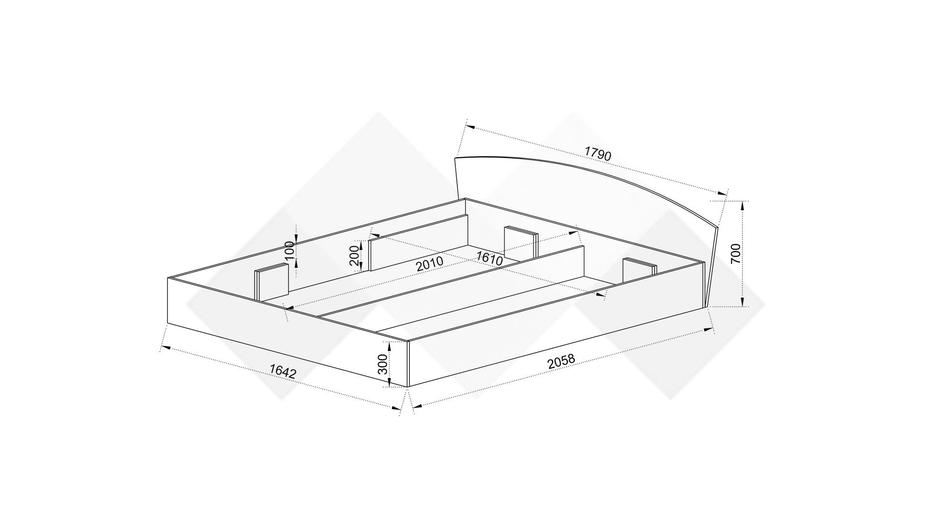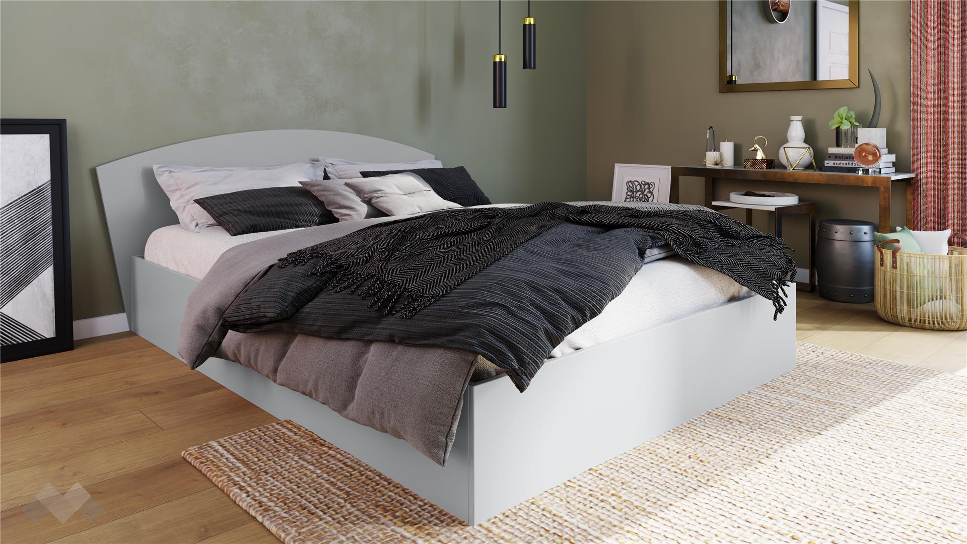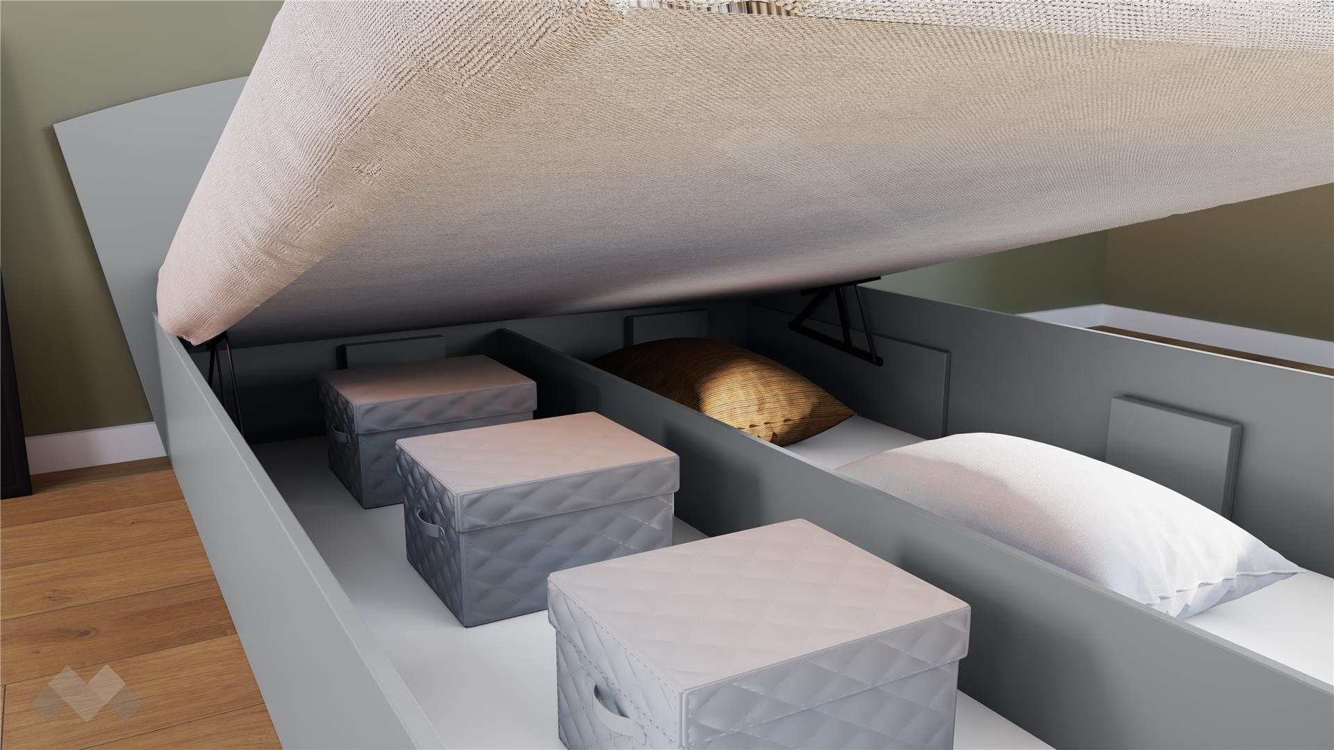 Спалнята е за матрак с размер 160/200 см. Включеният повдигащ механизъм осигурява лесен достъп до подматрачното пространство, което е идеално място за съхранение на спално бельо, одеяла, сезонни дрехи и други вещи. Заоблената табла омекотява линиите на дизайна.