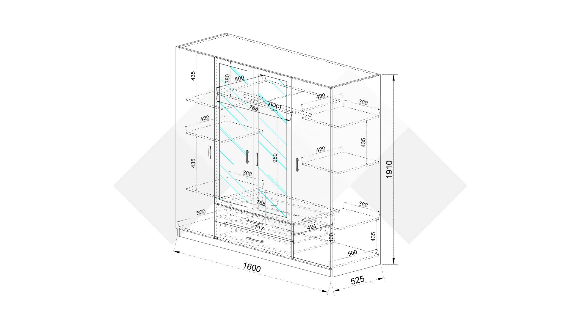 ✓ четирикрилен ✓ 2 чекмеджета ✓ 7 рафта ✓ 2 огледала ✓ лост за закачалки ✓ механизъм за плавно затваряне ✓ модерен декор ✓ практично разпределение ✓ качествена изработка ✓ 16 мм ПДЧ