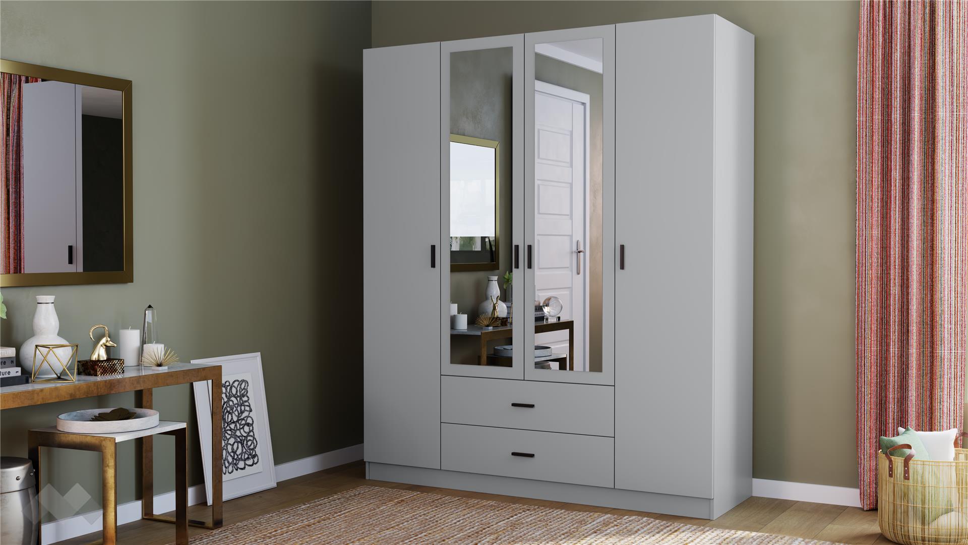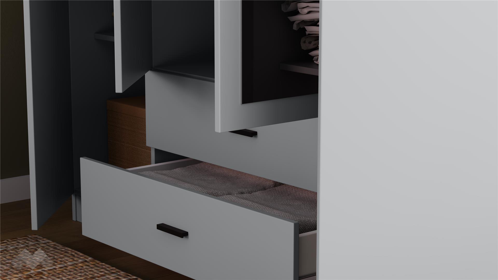 Той е практичен четирикрилен гардероб с 7 обемни рафта, лост за закачалки и две чекмеджета. В чекмеджетата можеш да организираш бельо или аксесоари, а рафтовете можеш да използваш за съхранение на сгънати дрехи, по-обемни пуловери, завивки или други вещи.