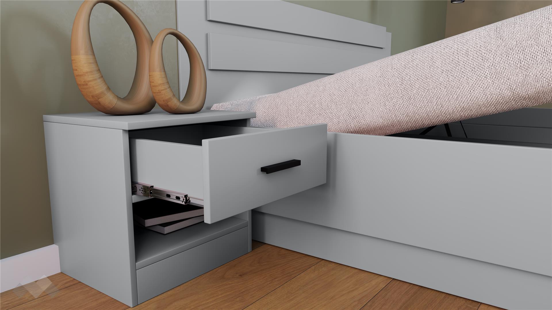 Към спалнята сме добавили и две нощни шкафчета. Всяко от тях разполага с чекмедже и отворен рафт, където да съхраняваш всички най-необходими вещи, които винаги да ти бъдат под ръка. Те са снабдени със сачмени водачи с пълно изтегляне и плавно прибиране, характеризиращи се със стабилност, устойчивост и издръжливост при по-голямо натоварване.