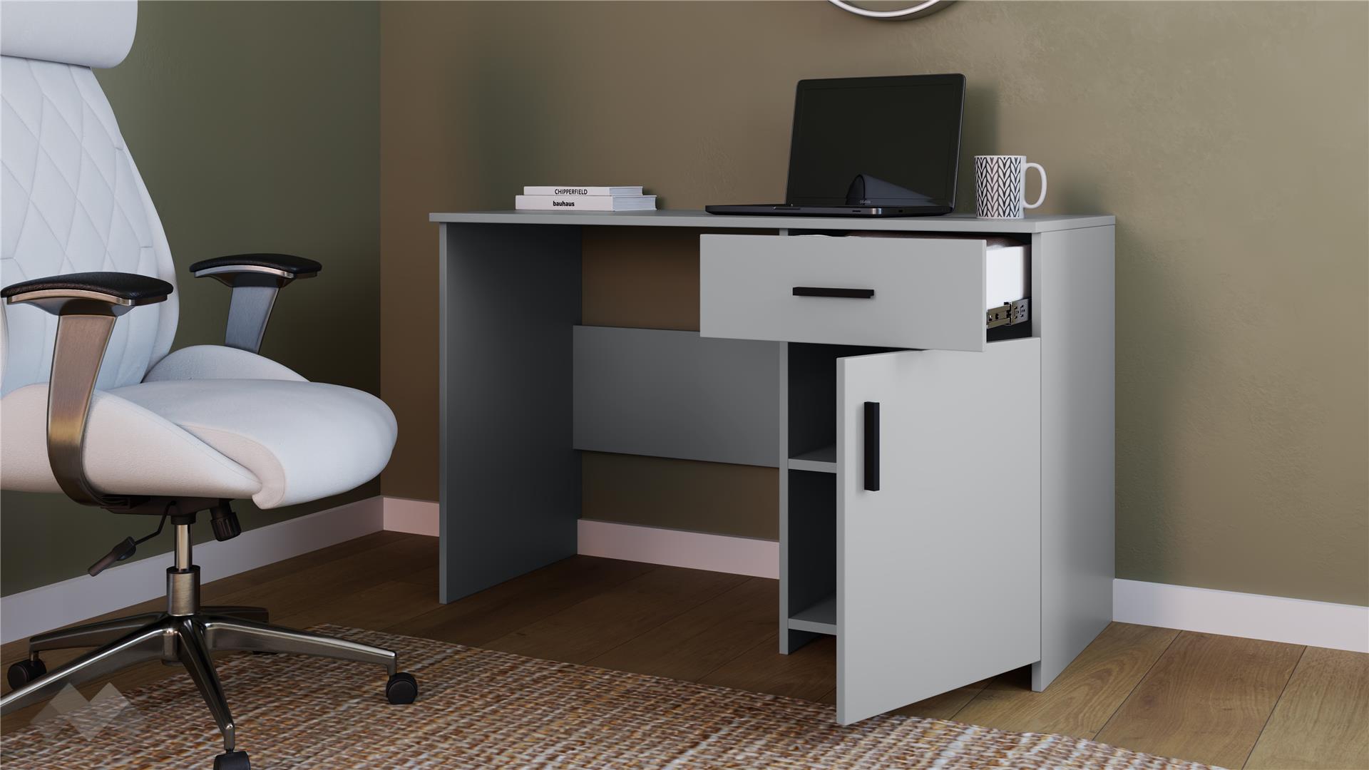 Бюрото разплага с чекмедже и с шкаф с вратичка. Отваряйки вратата на шкафа ще откриеш удобен вътрешен рафт, което ще ти осигури оптимално използване на пространството. Плотът е достатъчно широк, за да можеш да поставиш лаптоп или настолен компютър, но и в същото време ще остане място за декорации или други необходими вещи.