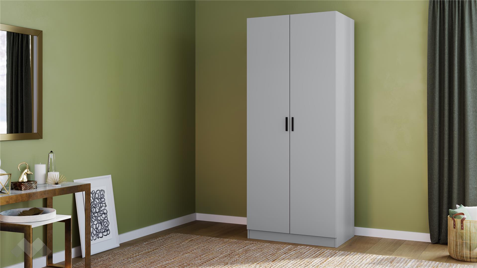 Двукрилният гардероб разполага с четири рафта и лост за закачалки, което ти позволява да организираш дрехите си по най-удобния за теб начин. Практичното вътрешно разпределение осигурява лесен достъп до всеки тоалет и оптимално използване на пространството.