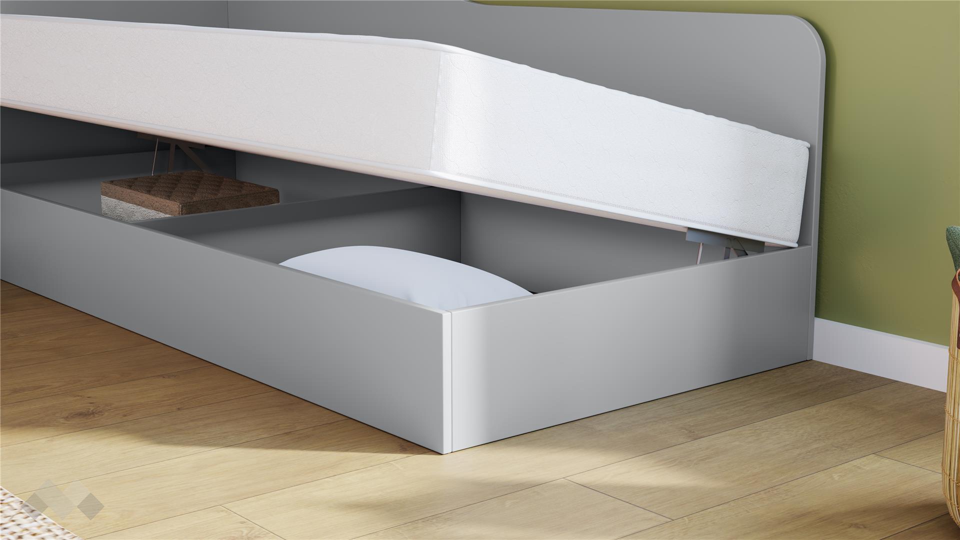 Ъгловото легло е подходящо за матрак с размери 82/190 см. Леглото е с универсално разположение – по време на монтажа, изолиращата табла и механизма могат да се монтират отляво или от дясно, така че да пасне идеално на стаята. Включеният повдигащ пружинен механизъм осигурява лесен и бърз достъп до подматрачното пространство, което е перфектно за съхранение на спално бельо, играчки, сезонни дрехи и други вещи.