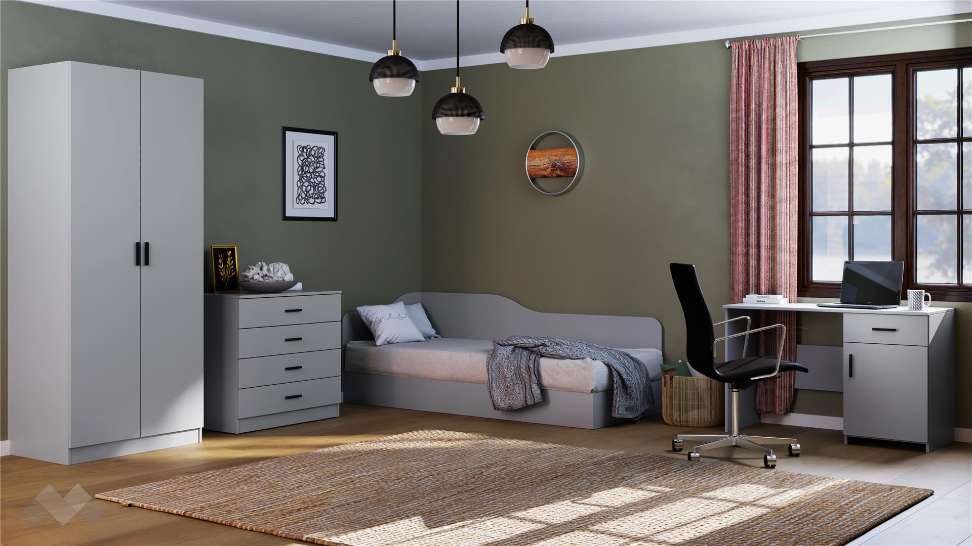 ✓ легло с меки линии ✓ за матрак 82/190 ✓ двукрилен гардероб с 4 рафта и лост за закачалки ✓ скрин с 4 чекмеджета ✓ бюро с шкаф и чекмедже ✓ семпъл дизайн ✓ повдигащ механизъм ✓ делител на подматрачното пространство ✓ механизъм за плавно затваряне ✓ качествена изработка ✓ 16 мм ПДЧ