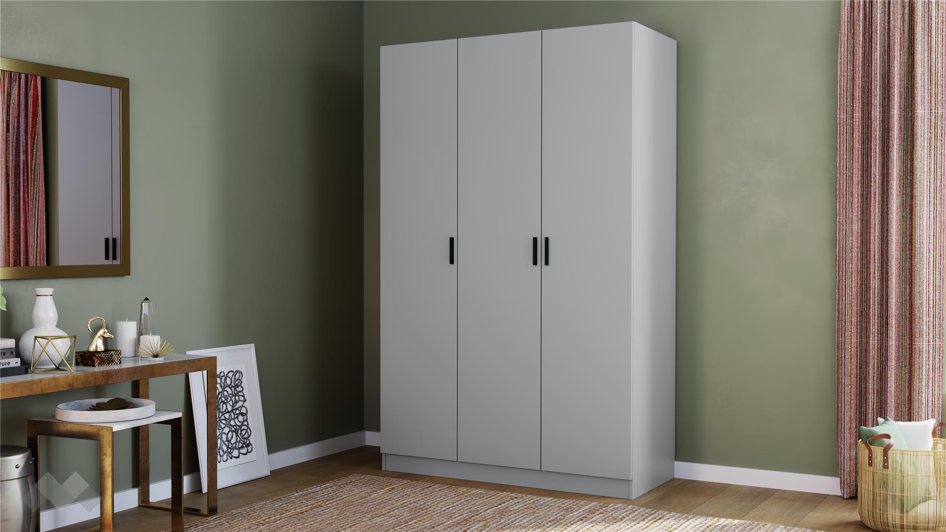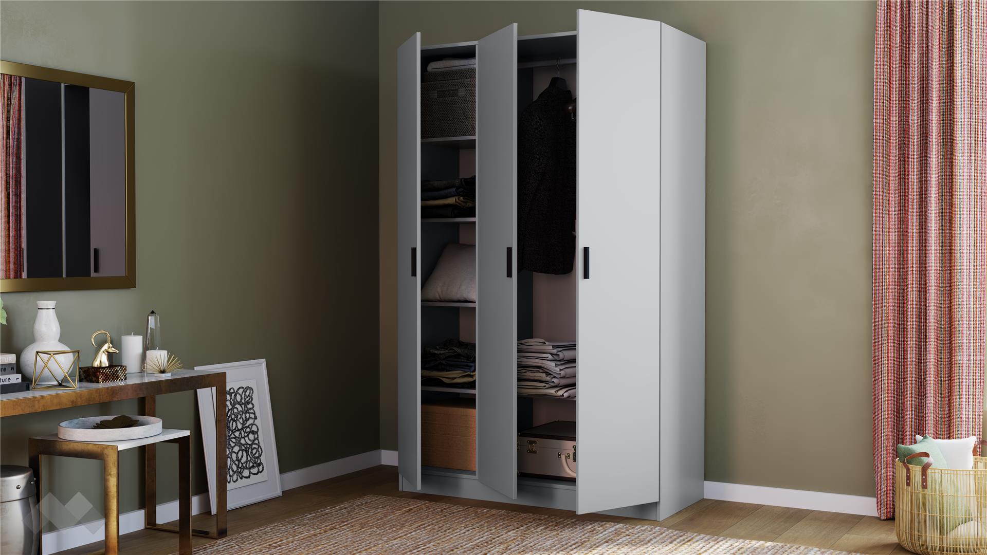 Гардеробът е трикрилен, с практично разпределение, което ти позволява да подредиш добре всички вещи. Той разполага с пет рафта и лост за закачалки, което ти дава възможност да подредиш дрехите си по най-удобния за теб начин.Всяка дреха ще намери своето подходящо място, а ежедневният избор на тоалет ще се превърне в лесен и приятен ритуал, който няма да отнема от времето ти.