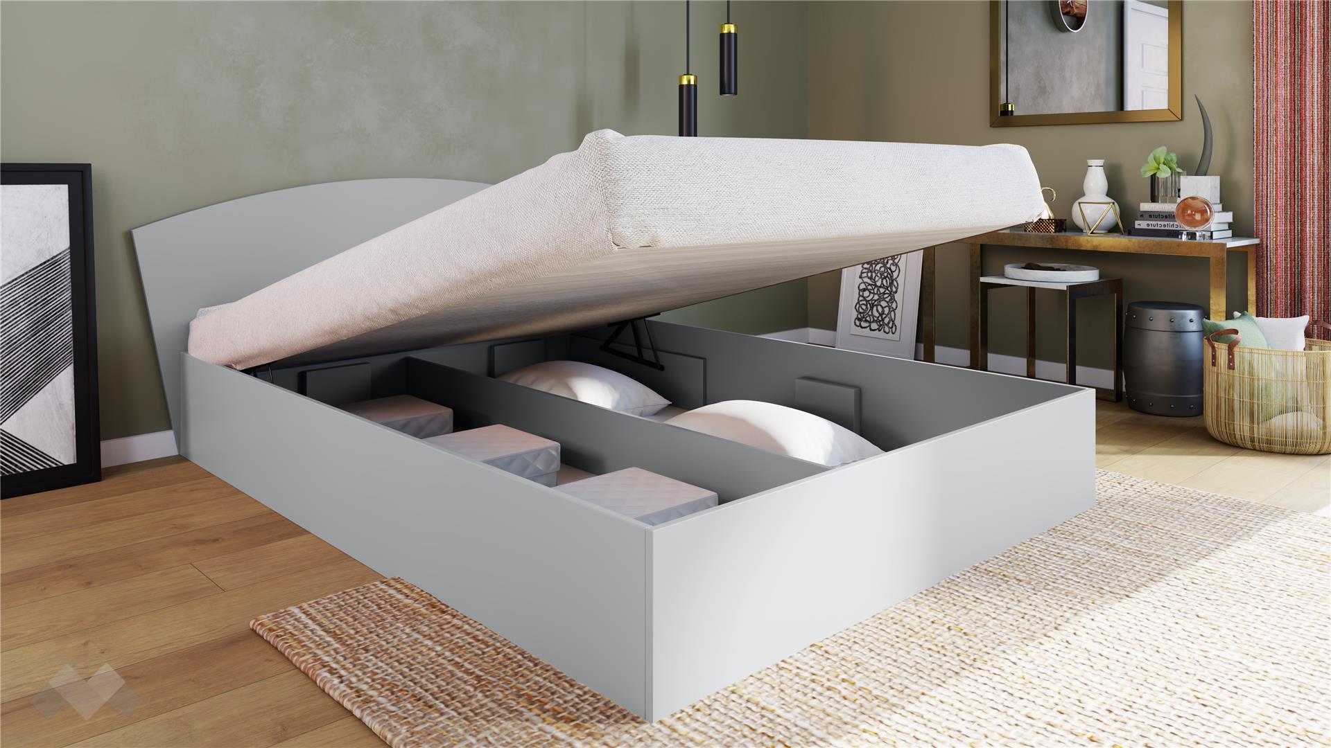 Спалнята е подходяща за матрак с размер 160/200 см. Включеният повдигащ механизъм осигурява лесен достъп до подматрачното пространство, което е идеално място за съхранение на спално бельо, одеяла, сезонни дрехи и други вещи. Заоблената табла омекотява линиите на дизайна и допринася за по-уютна и спокойна атмосфера в помещението.