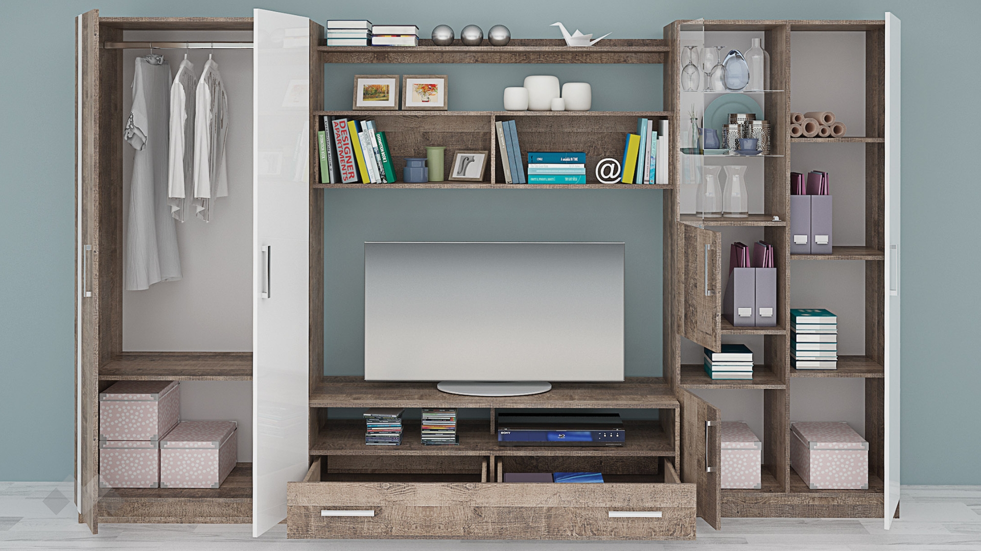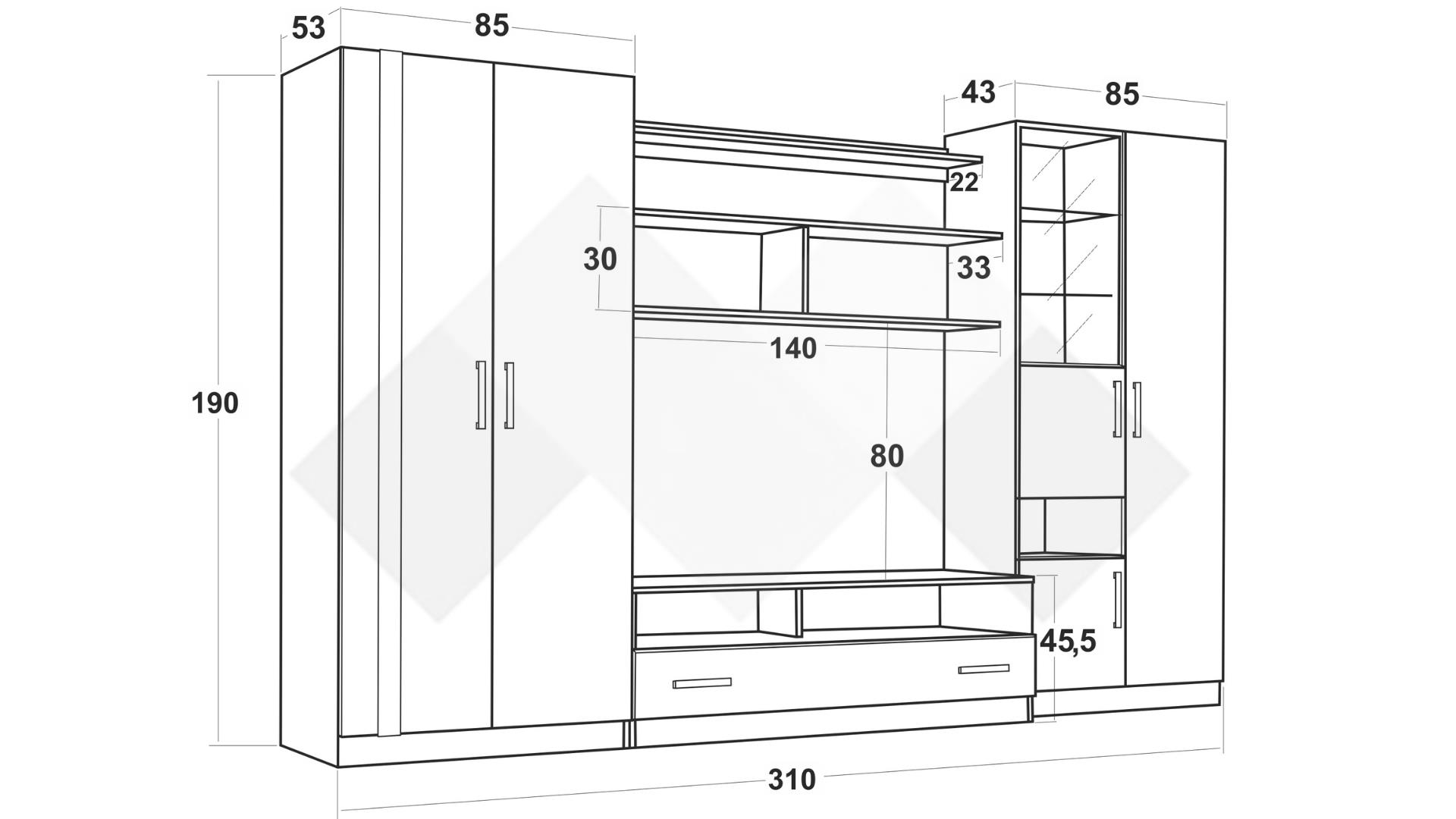 Основата на секцията представлява ТВ шкаф, състоящ се от две чекмеджета с общо чело и две отворени ниши. Там ще откриеш достатъчно място за цялата си съпътстваща техника като ТВ приемници, DVD плейъри или други. Над ТВ шкафа разполагаш с два отворени шкафа и етажерка. Те са идеални за подреждане на книги, сувенири, скъпи фотографии или красиви декорации. Високият шкаф се състои от витрина, два шкафа с вратички, отворена ниша и голям затворен шкаф. Витрината е с два остъклени рафта, подходящи за красивите ти сервизи, които ще засияят благодарение на дискретното LED осветление. Зад вратата на големия затворен шкаф се крият три рафта, удобни за всички неща, които предпочиташ да останат скрити. В двукрилния гардероб можеш да организираш дрехите, за които все не ти достига място в гардероба в спалнята. На твое разположение са лост за закачалки и широк рафт.