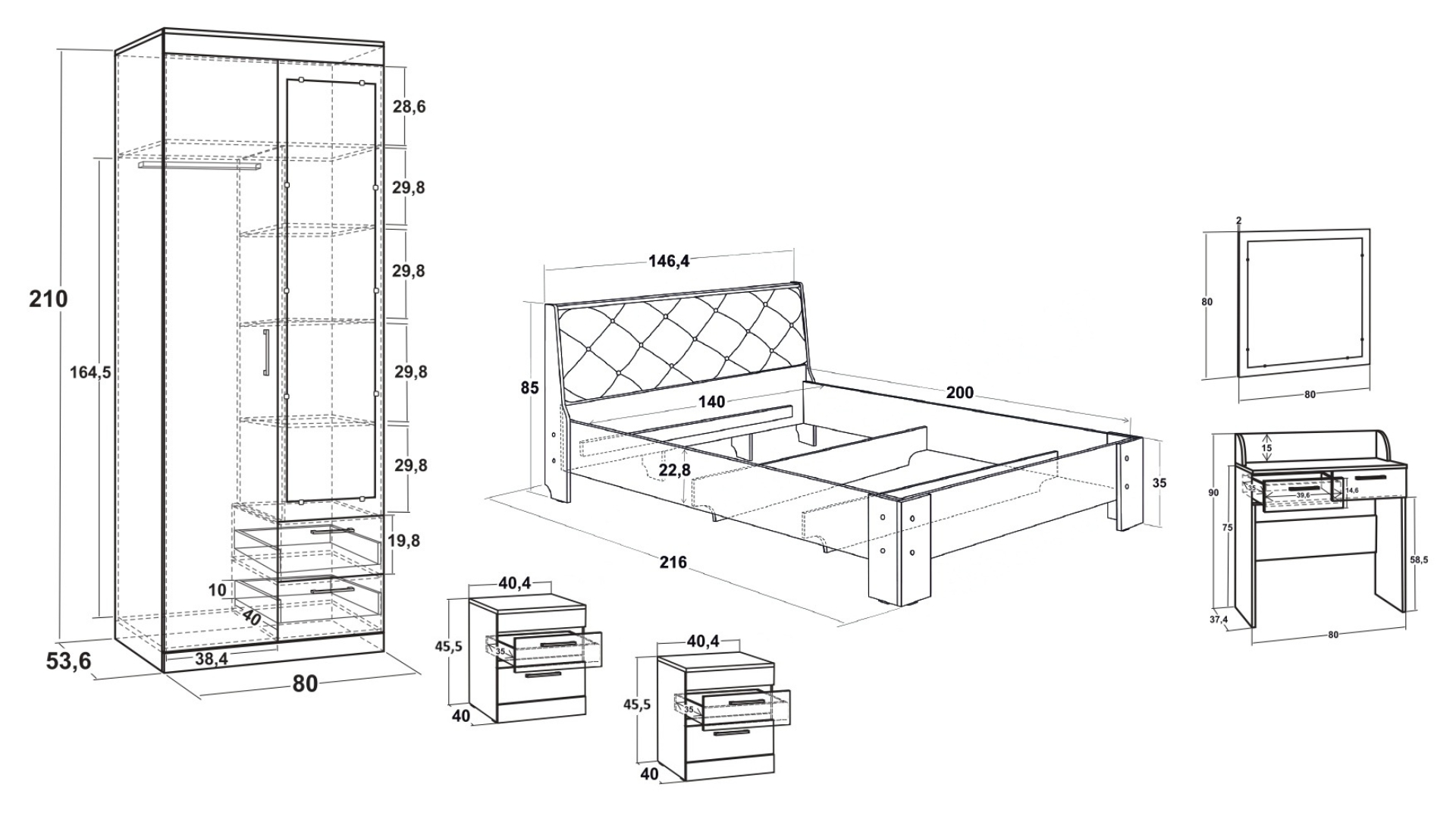 ⭐ Предимства: ✓ спалня с тапицирана табла ✓ двукрилен гардероб ✓ тоалетка ✓ огледало ✓ 2 броя нощни шкафчета ✓ елегантен дизайн ✓ качествена изработка ✓ 16 мм ПДЧ