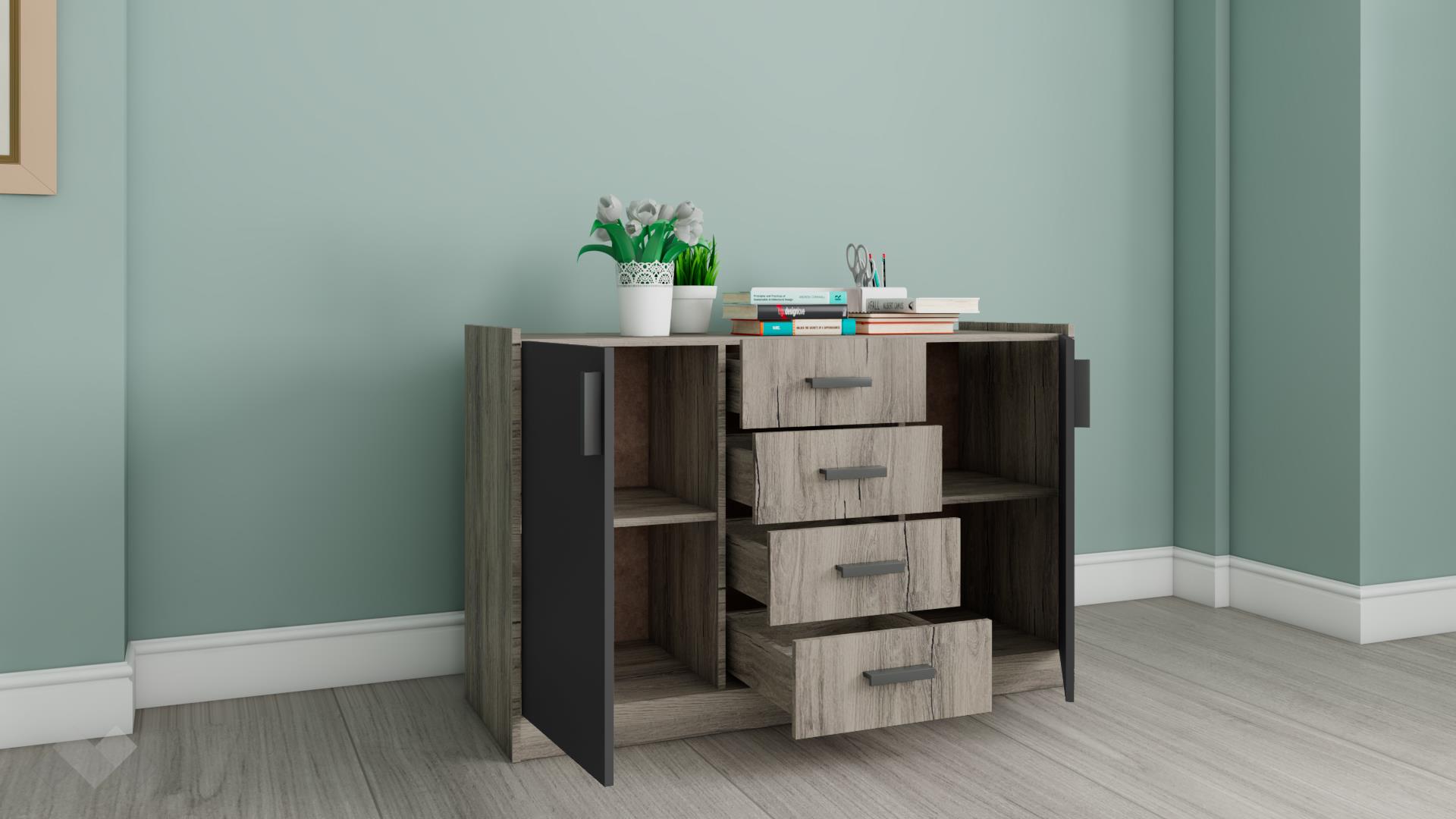 ⭐ Предимства: ✓ 4 чекмеджета ✓ 2 затворени шкафа ✓ компактен и практичен ✓ модерен винтидж декор с WNR структура ✓ качествена изработка ✓ 16 мм ПДЧ