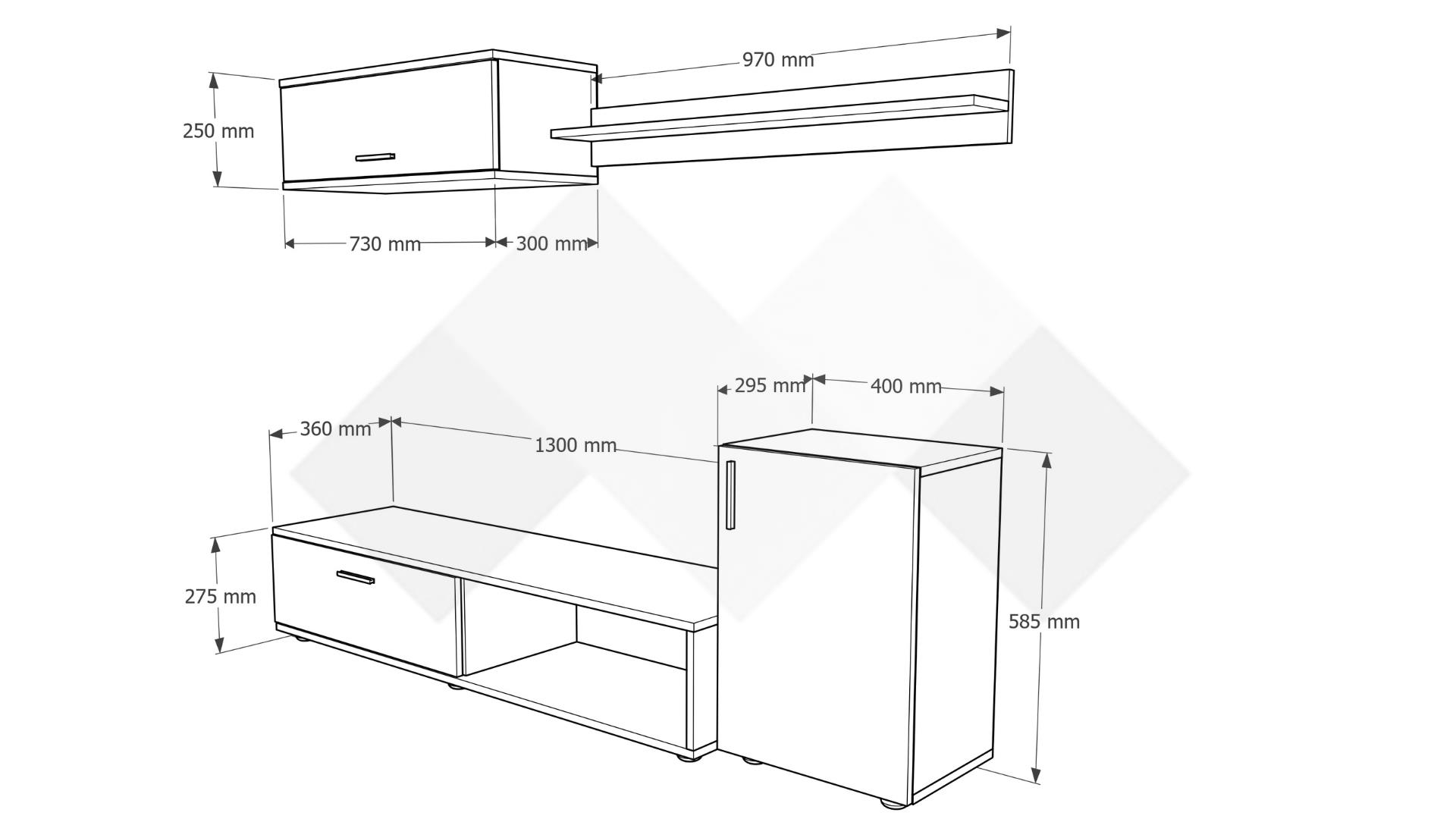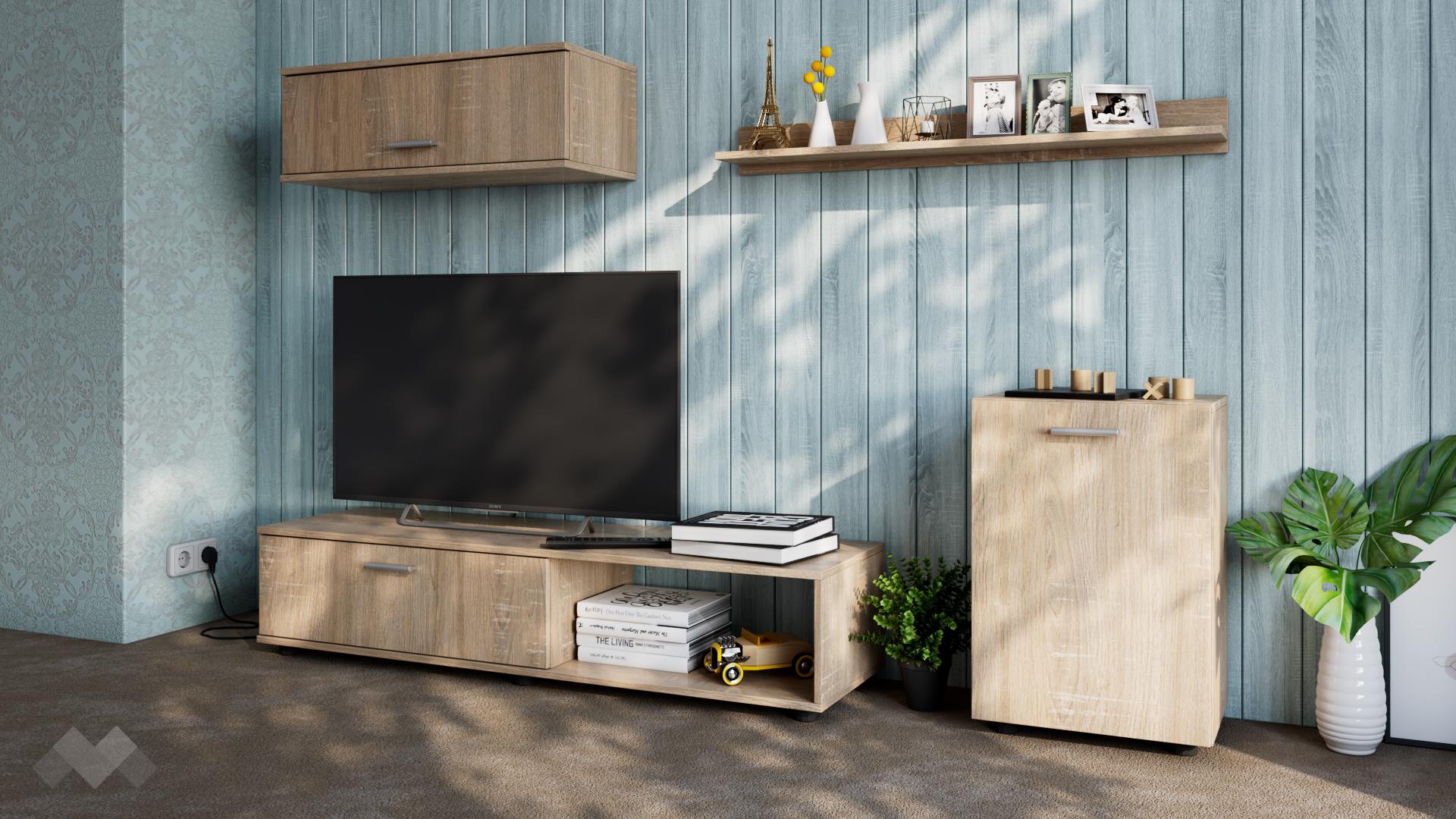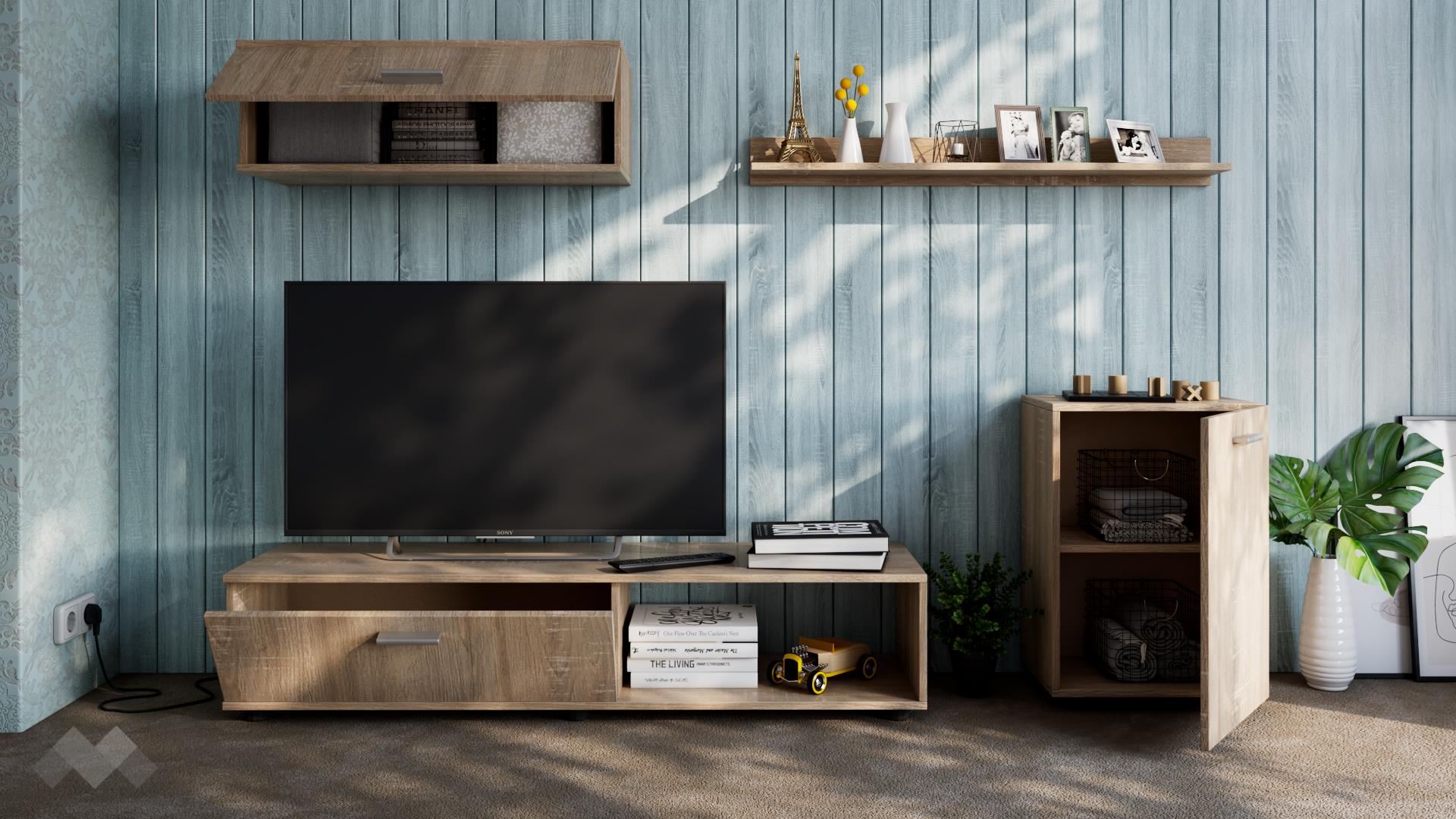 Секция Стенли е компактна и много практична мебел. Въпреки малките си размери, тя ти предлага добре организирано място за съхранение. ТВ шкафът се състои от шкаф с падаща врата и отворена ниша, в които можеш да организираш цялата си съпътстваща техника като декодери, плеъри, конзоли и други. Високият шкаф ще ти предостави достатъчно място, където с лекота ще аранжираш необходимите ти в ежедневието вещи. Окаченият шкаф също ще ти е от полза – той ще приюти всички неща, които предпочиташ да останат скрити, но искаш винаги да са ти под ръка. Към секцията сме добавили и практична етажерка, подходяща за подреждане на книги, скъпи спомени като фотографии или сувенири, а можеш и да аранжираш със стилни декорации и украси – изборът е твой!
