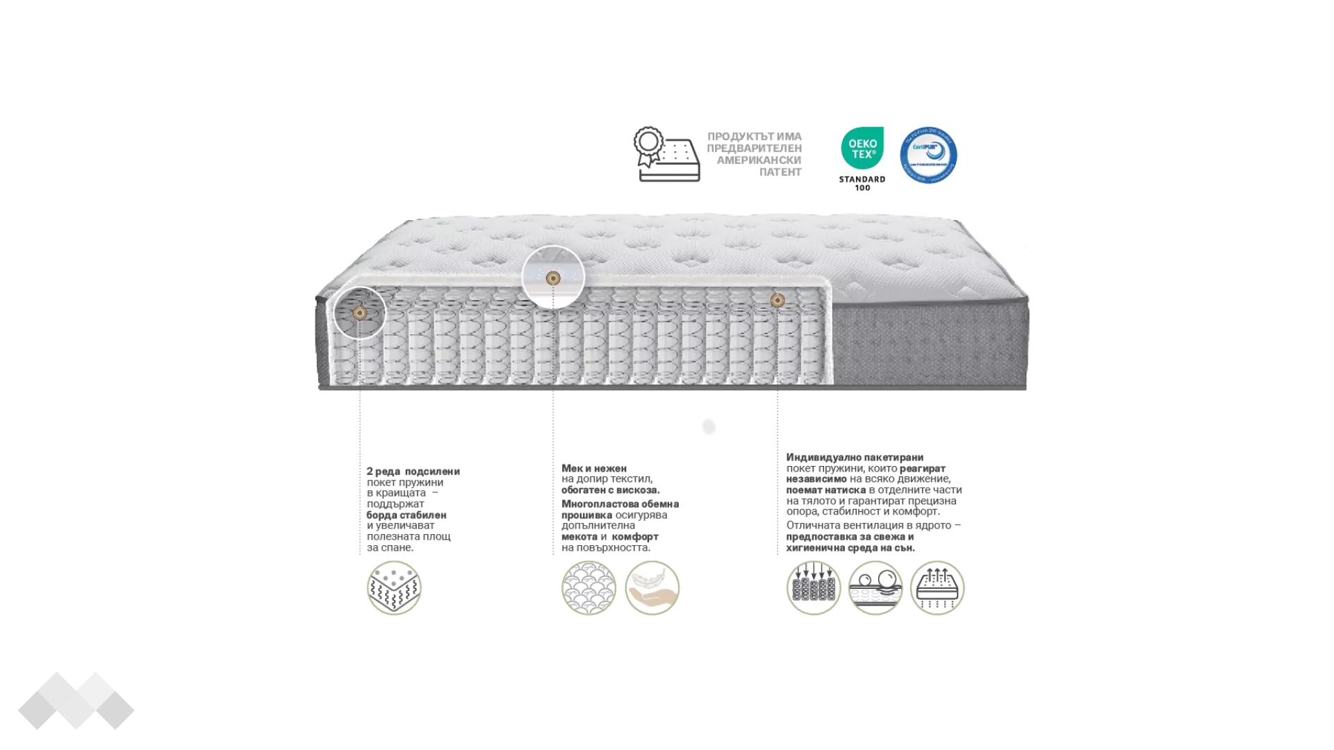 Ядрото му е изградено от Pocket Spring система, с индивидуално пакетирани пружини, които дават надеждна опора и правилна поддръжка на гръбнака, врата и тялото.