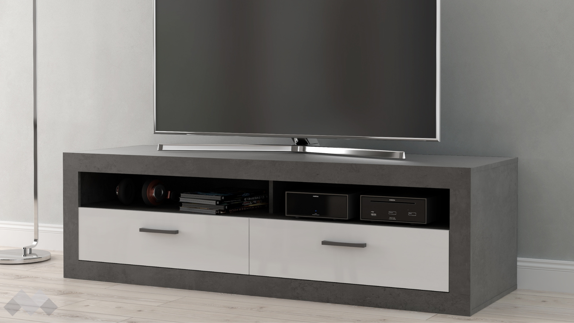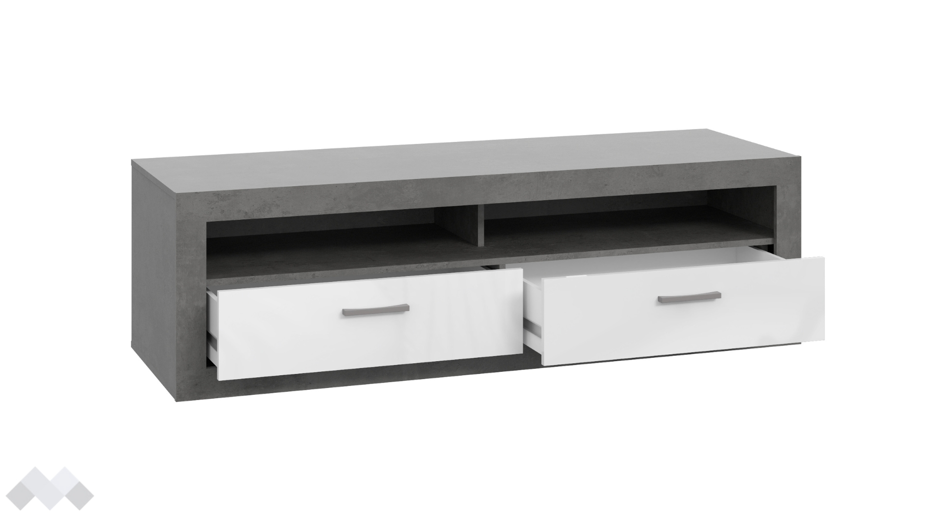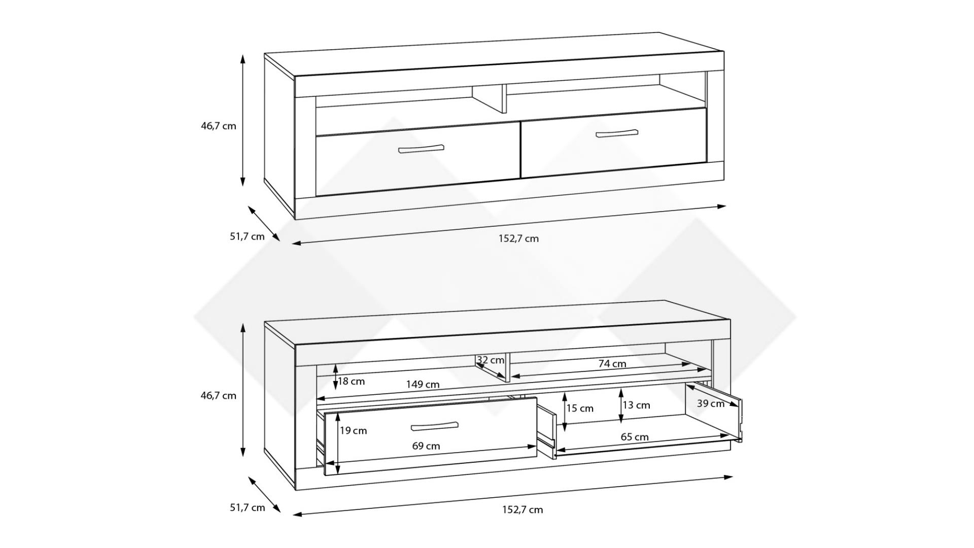 ТВ шкаф Требия е практична мебел, която разполага с 2 отворени рафта, на които можеш да поставиш декодери, конзоли и друга съпътстваща техника към своя телевизор. В допълнение, шкафът включва 2 чекмеджета с телескопични водачи, които осигуряват плавно отваряне и затваряне. Телескопичните водачи предлагат допълнителна устойчивост и стабилност, което прави чекмеджетата надеждни при ежедневна употреба.