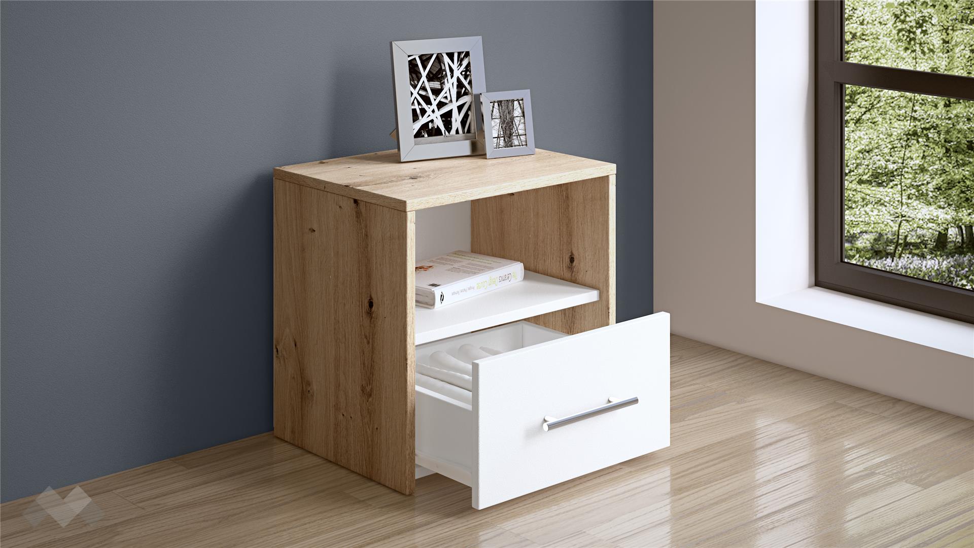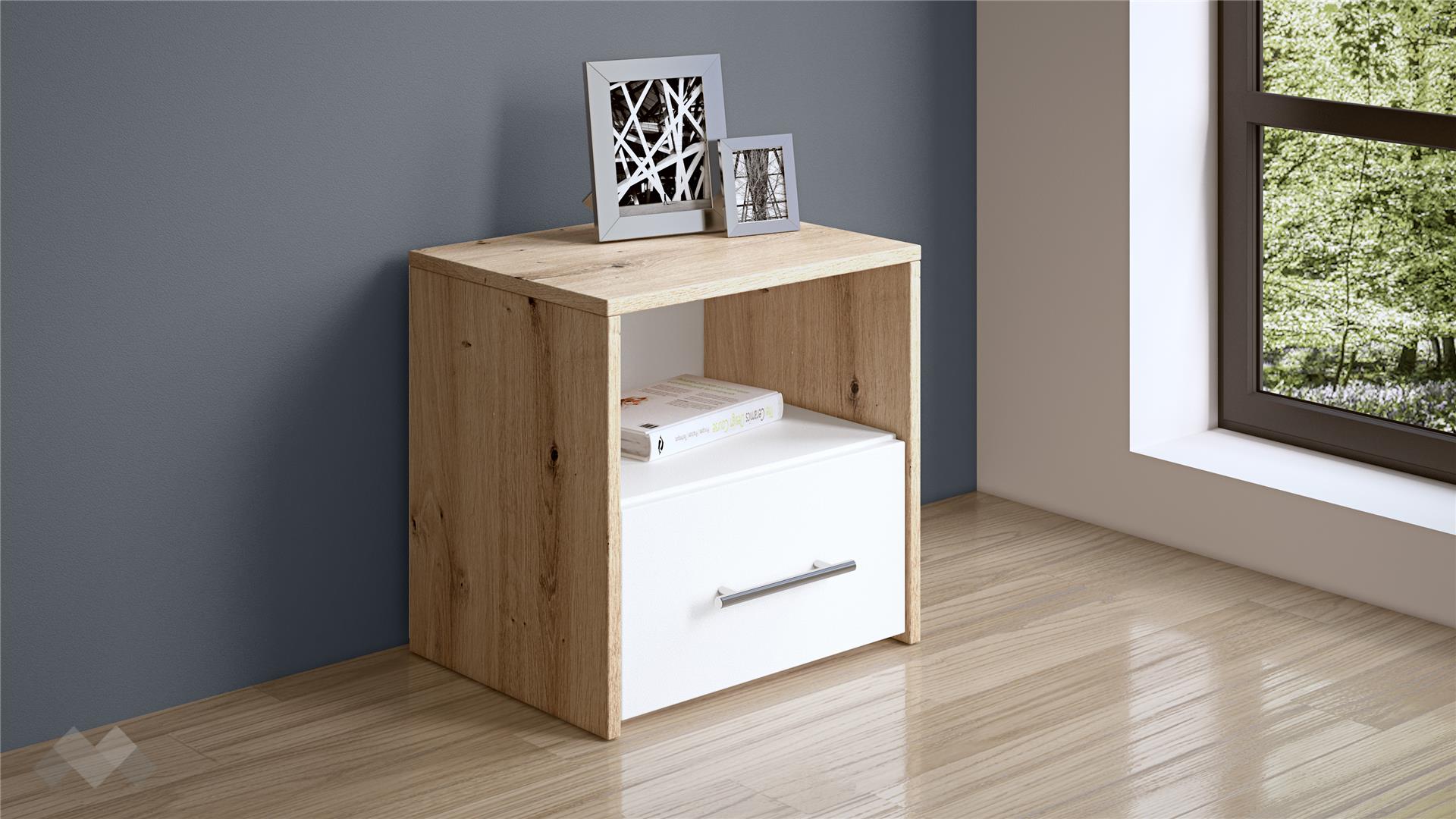Искаш да създадеш хармоничен и натурален интериор в спалнята, създаващ усещане за уют, комфорт и неподправеност? Нощен шкаф Вангард е перфектното съчетание на семпъл и изчистен дизайн в комбинация от цвят артизан с бяло, носещ асоциации на близък до природата дизайн.