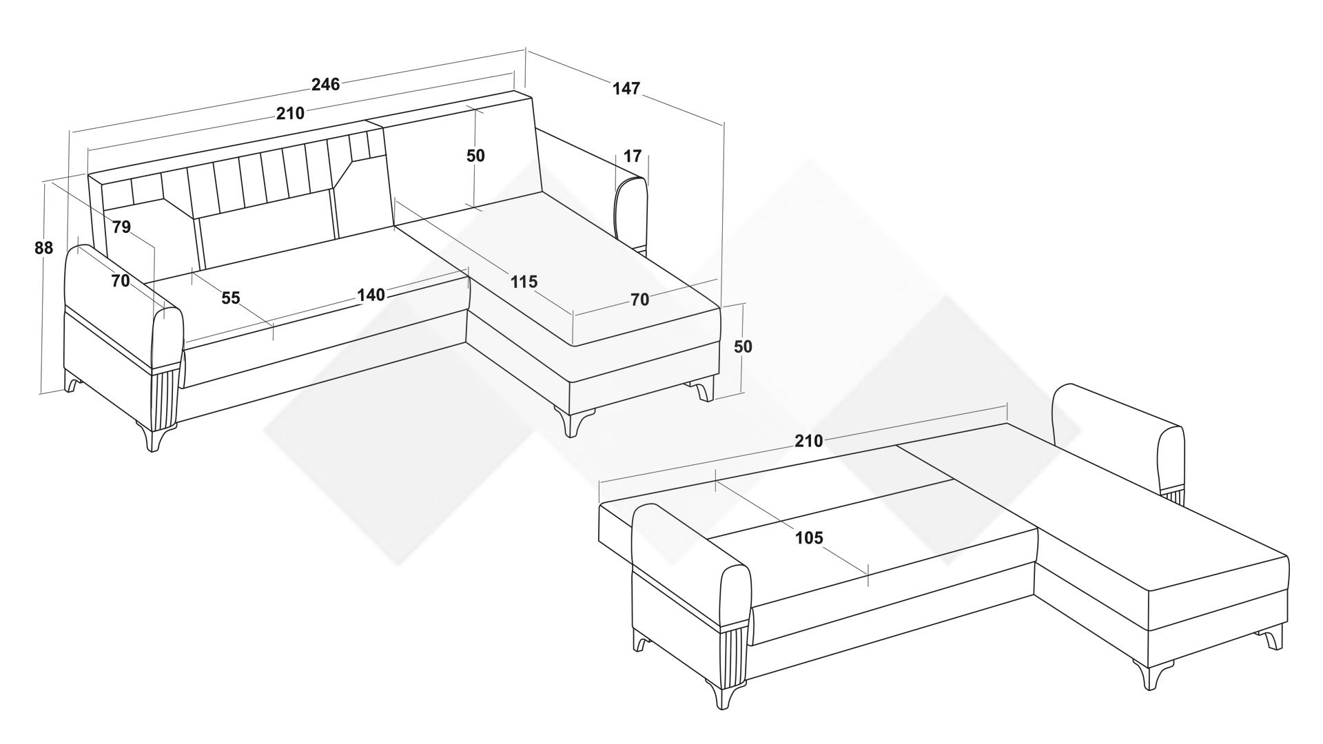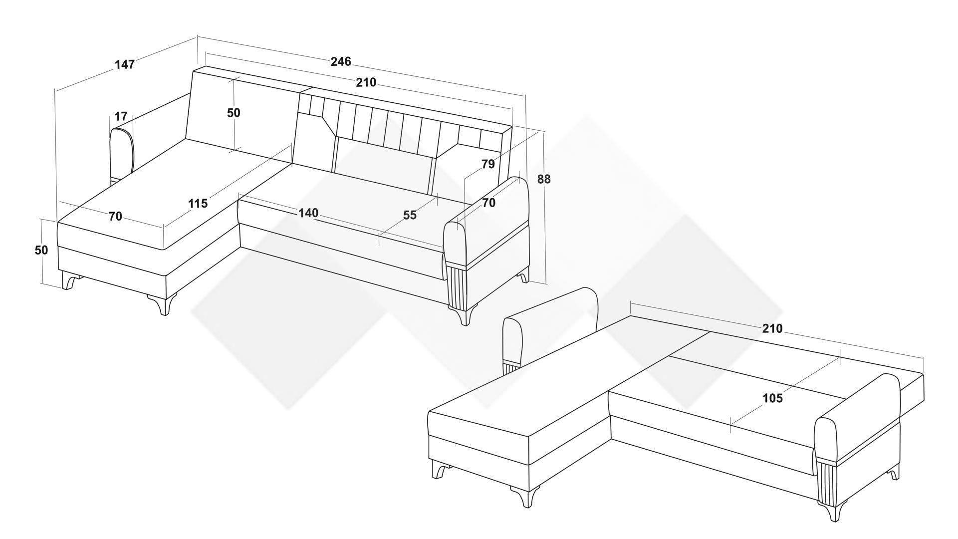 Освен елеганстен, Ъглов диван Верино е и функционален - с минимално усилие се превръща в комфортно и просторно легло с размери 105/210 см, благодарение на клик-клак механизъм. Под лежанката и терминала се крият по една ракла, в която може да съхраниш завивки, още възглавници или вещи, които да са на една ръка разстояние.