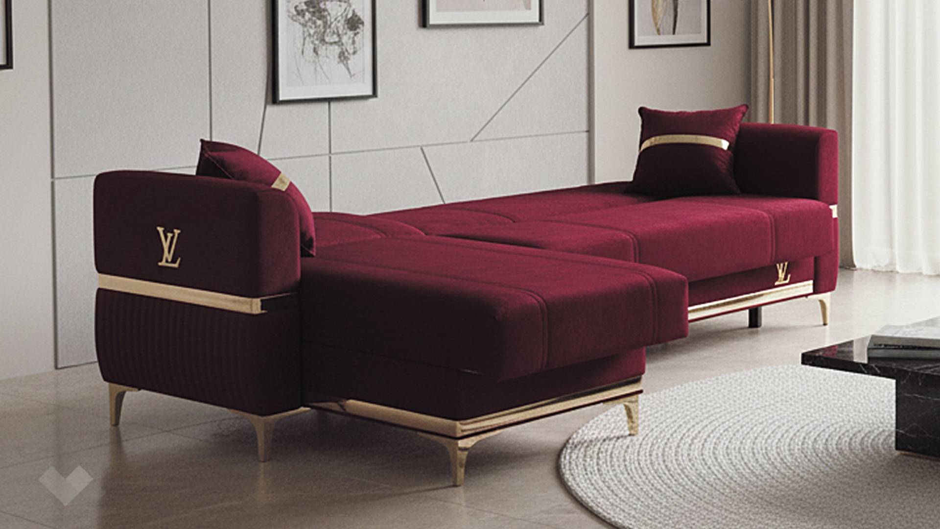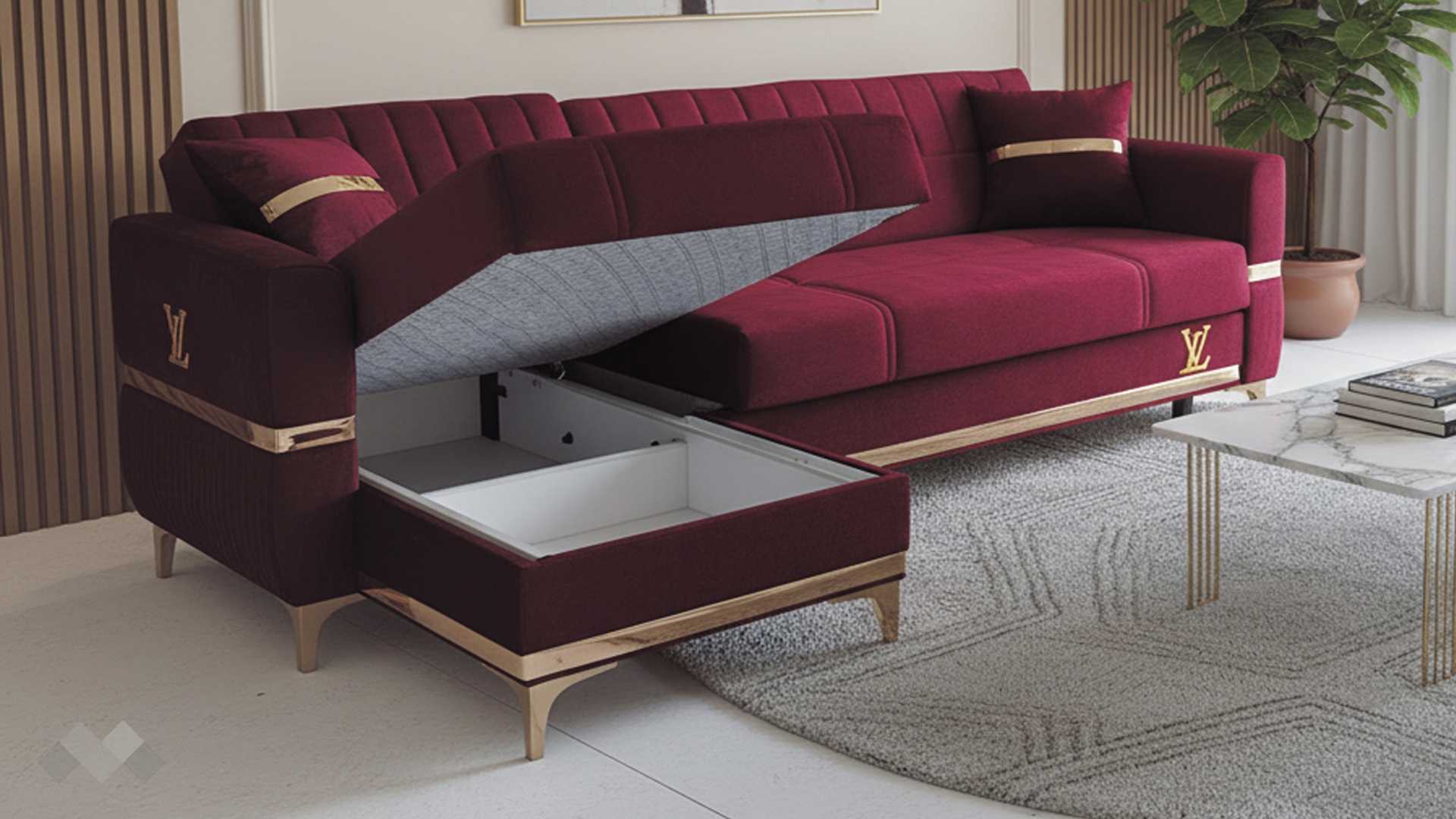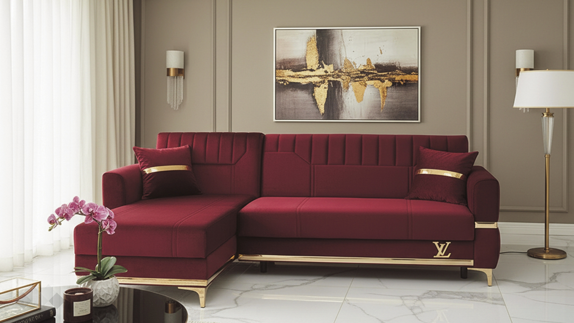 Елегантният Ъглов диван Верино впечатлява с луксозен дизайн и изключително внимание към детайла. Моделът комбинира топли цветове с изящни златисти акценти, които му придават премиум излъчване и създават усещане за класa и елегантност.