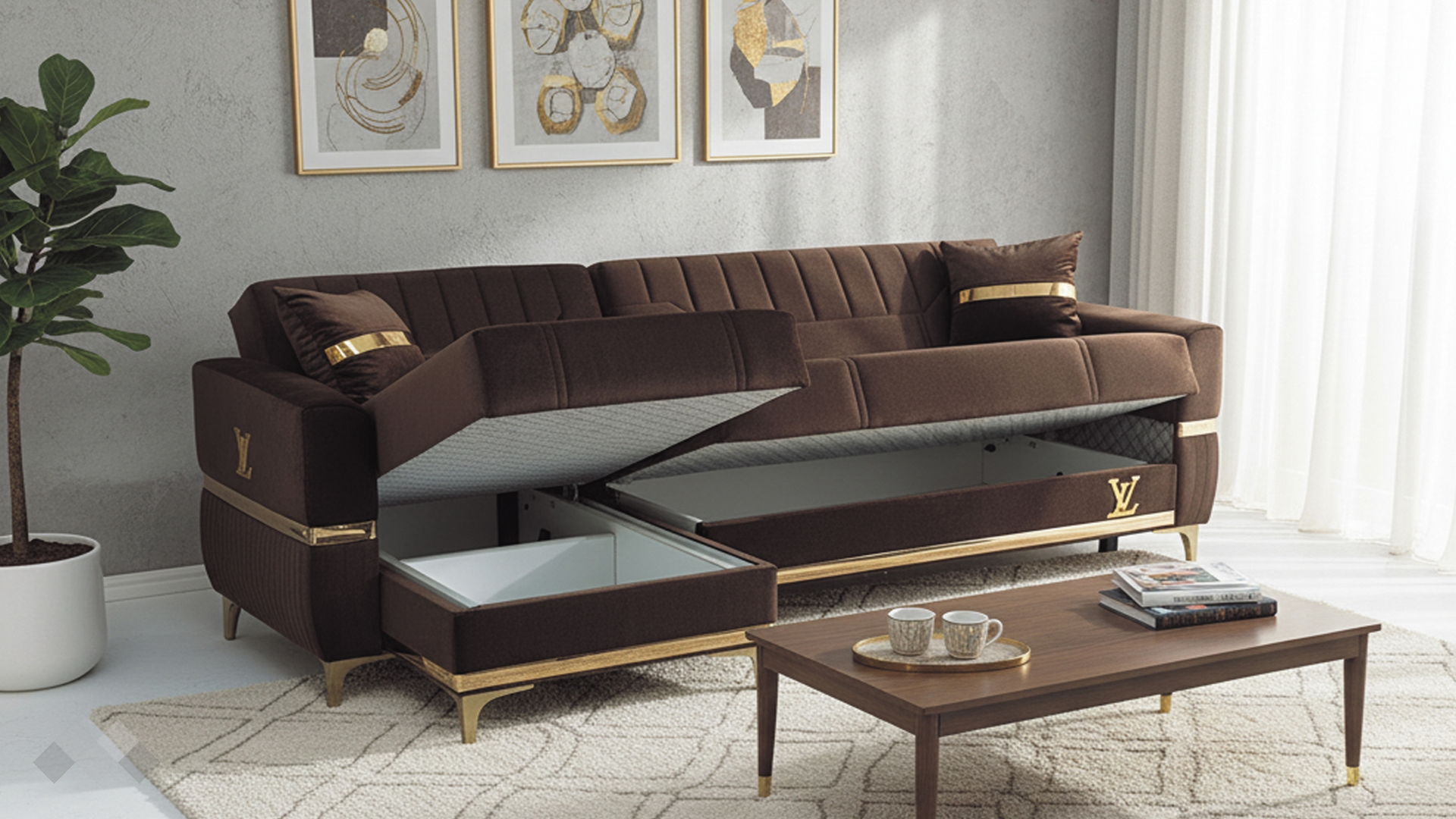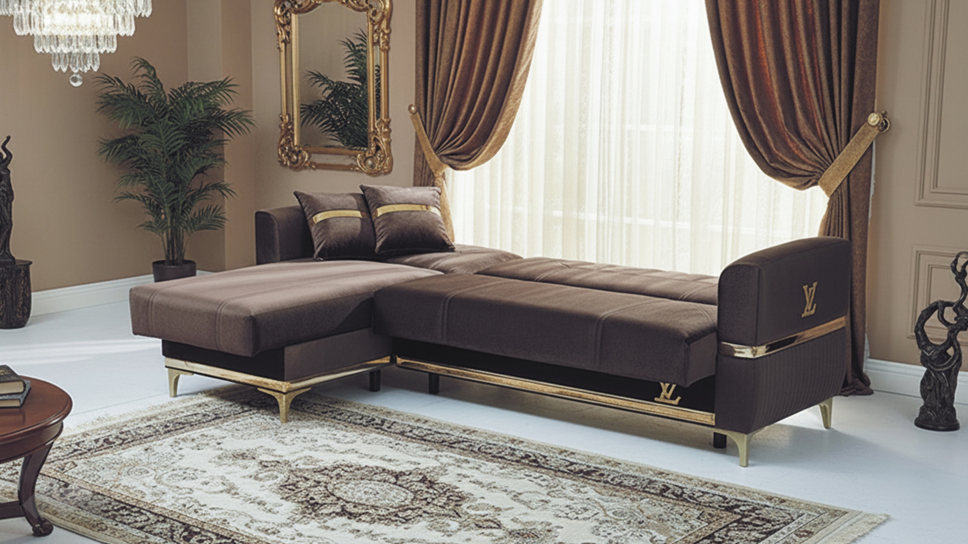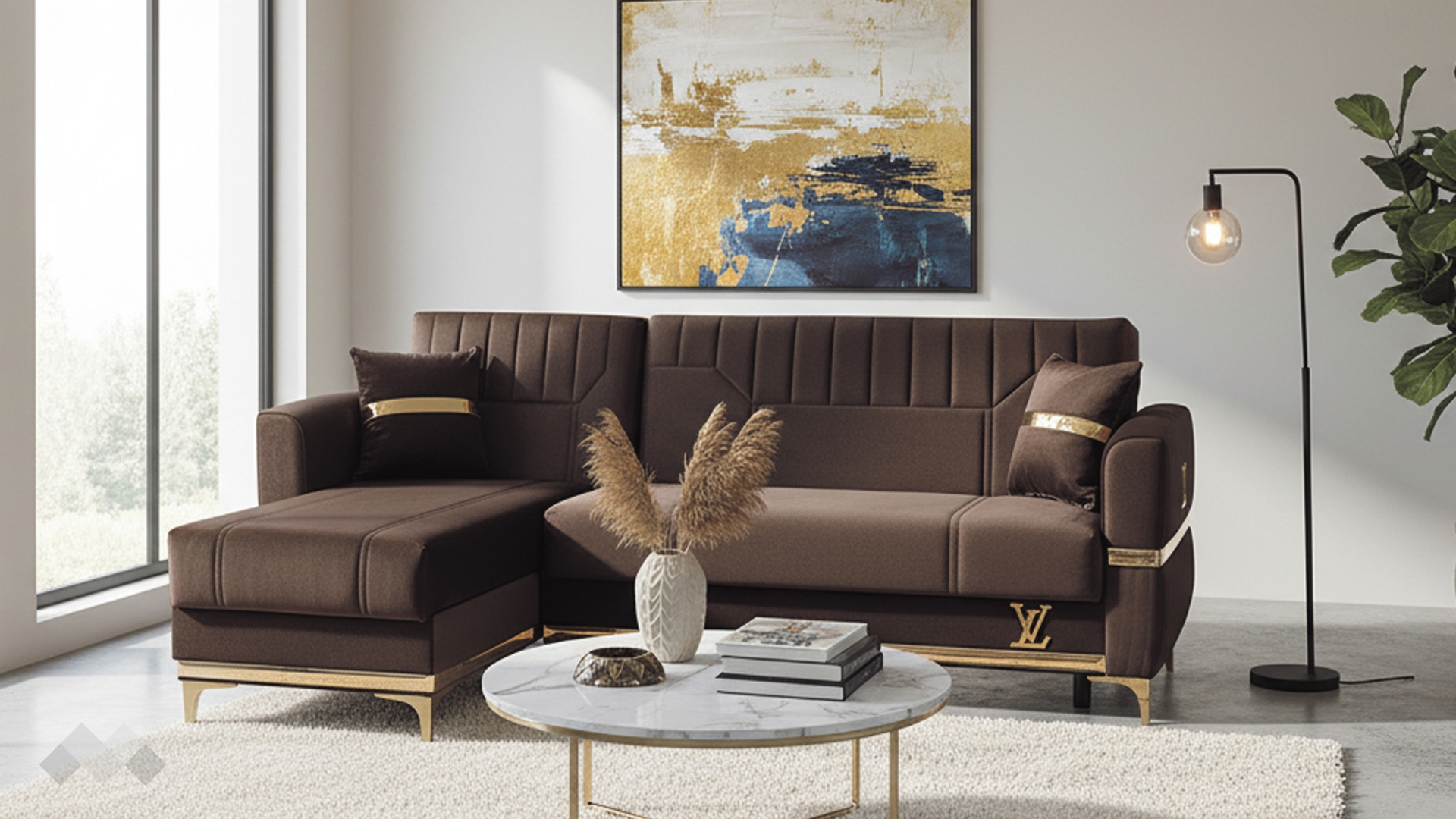 Елегантният Ъглов диван Верино впечатлява с луксозен дизайн и изключително внимание към детайла. Моделът комбинира топли цветове с изящни златисти акценти, които му придават премиум излъчване и създават усещане за класa и елегантност.