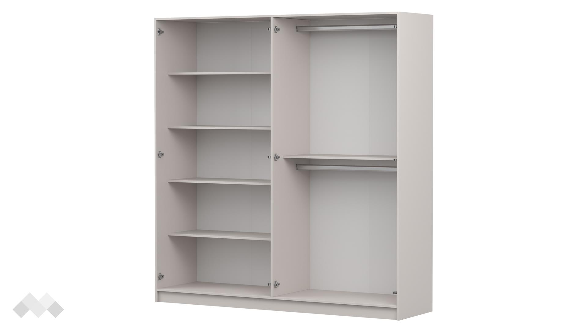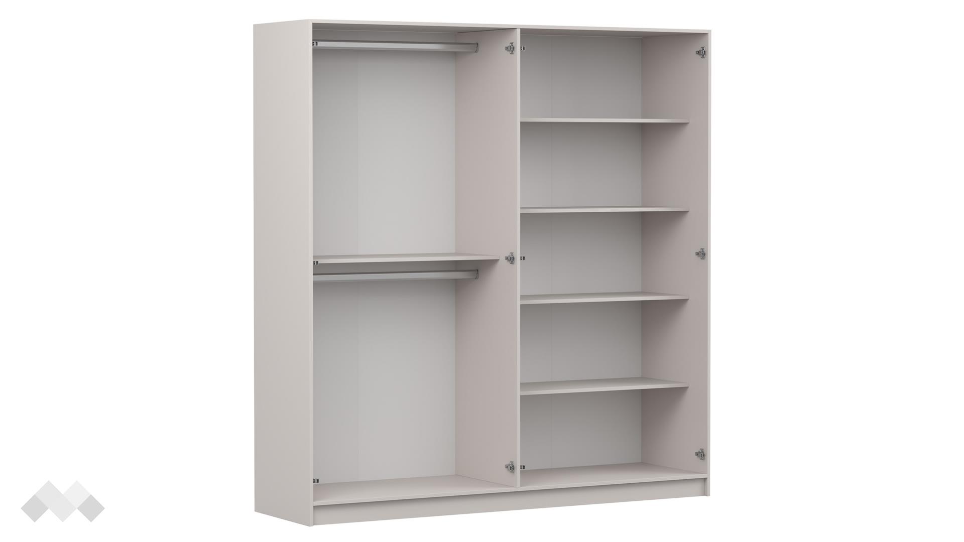 Гардеробът предлага добре организирано вътрешно пространство с 2 лоста за закачалки и 5 рафта, които осигуряват удобство при подредбата на различни видове облекла и аксесоари. Това го прави отличен избор за всяко домакинство, което търси ред и ефективно разпределение на пространството.